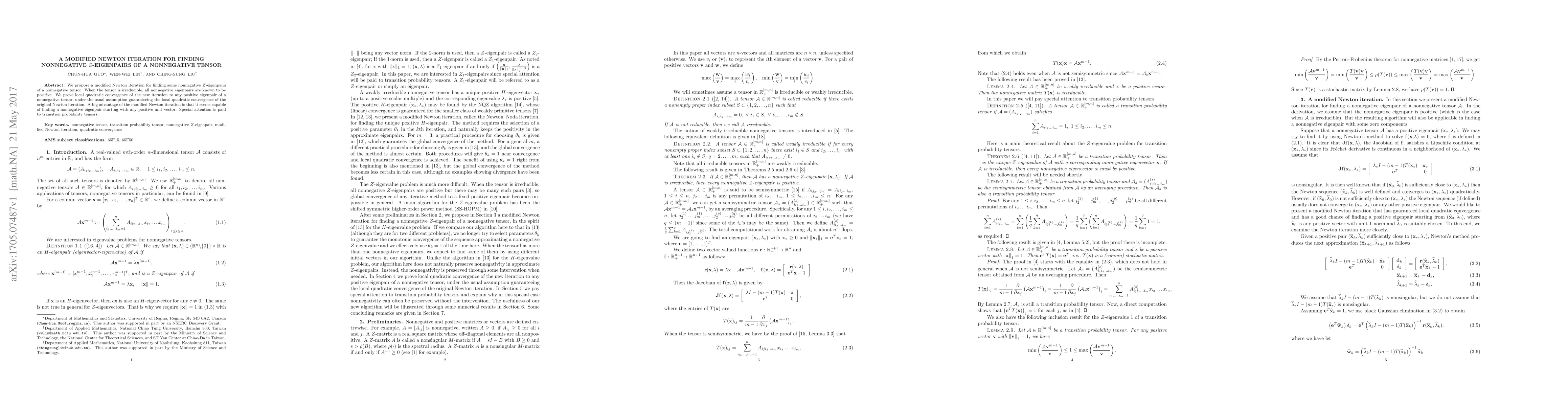 This paper proposes a modified Newton iteration method for identifying nonnegative Z-eigenpairs of nonnegative tensors. It demonstrates local quadratic convergence to positive eigenpairs and highlights its ability to start from any positive unit vector, with special focus on transition probability tensors.