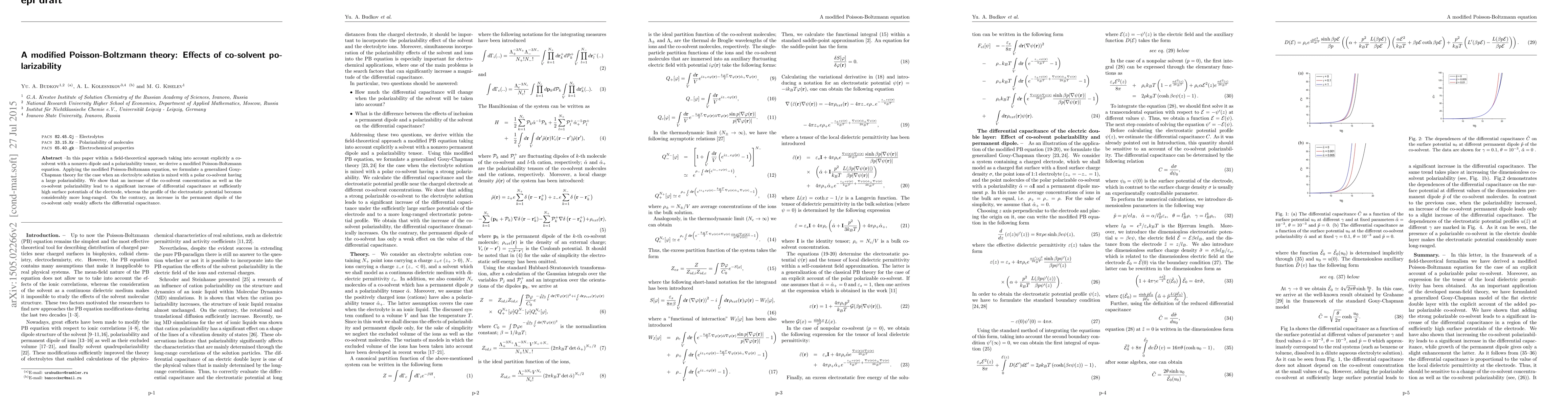 In this paper within a field-theoretical approach taking into account explicitly a co-solvent with a nonzero dipole and a polarizability tensor, we derive a modified Poisson-Boltzmann equation. Applying the modified Poisson-Boltzmann equation, we formulate a generalized Gouy-Chapman theory for the case when an electrolyte solution is mixed with a polar co-solvent having a large polarizability. We show that an increase of the co-solvent concentration as well as the co-solvent polarizability lead to a significant increase of differential capacitance at sufficiently high surface potentials of the electrode, whereas the profile of the electrostatic potential becomes considerably more long-ranged. On the contrary, an increase in the permanent dipole of the co-solvent only weakly affects the differential capacitance.