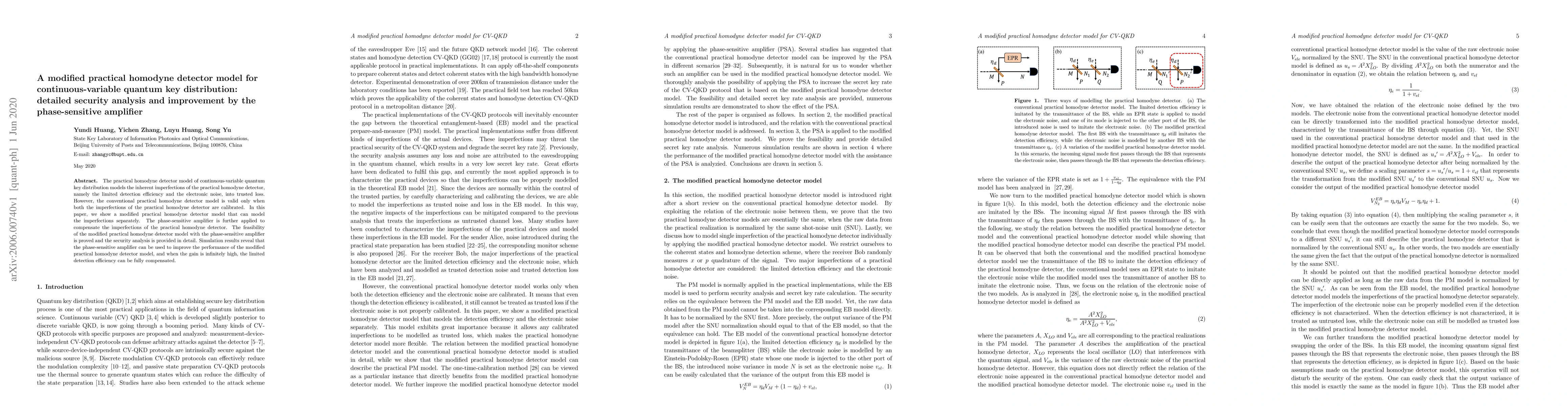 This paper proposes a modified practical homodyne detector model for continuous-variable quantum key distribution, allowing separate modeling of detection efficiency and electronic noise. The phase-sensitive amplifier is used to compensate for these imperfections, significantly improving the system's performance.