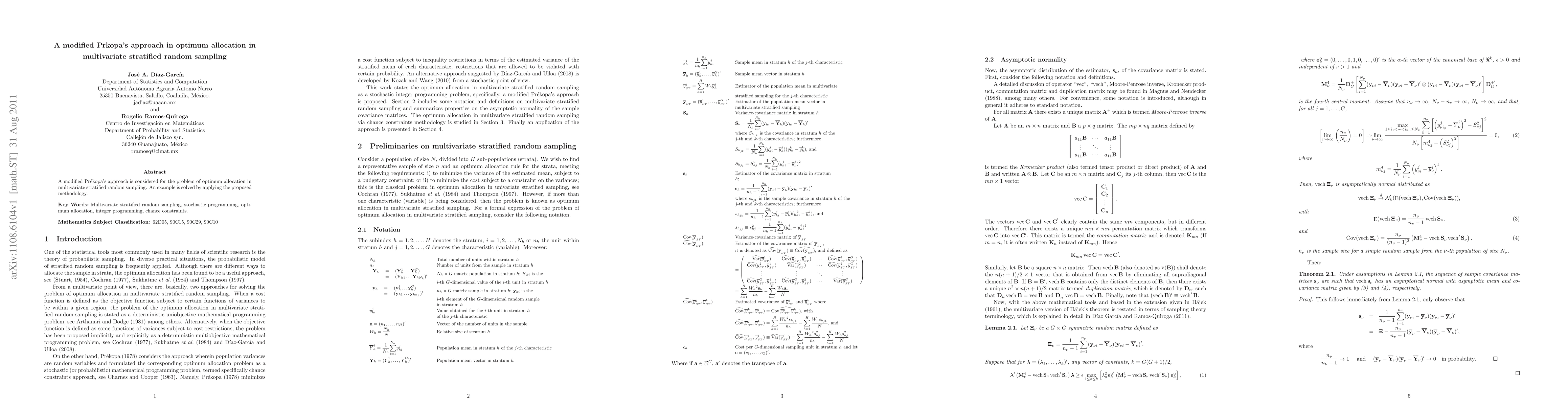 Summary: This paper proposes a modified Prekopa's approach for optimum allocation in multivariate stratified random sampling, demonstrating its effectiveness through a solved example. The methodology aims to enhance allocation efficiency in complex sampling scenarios.