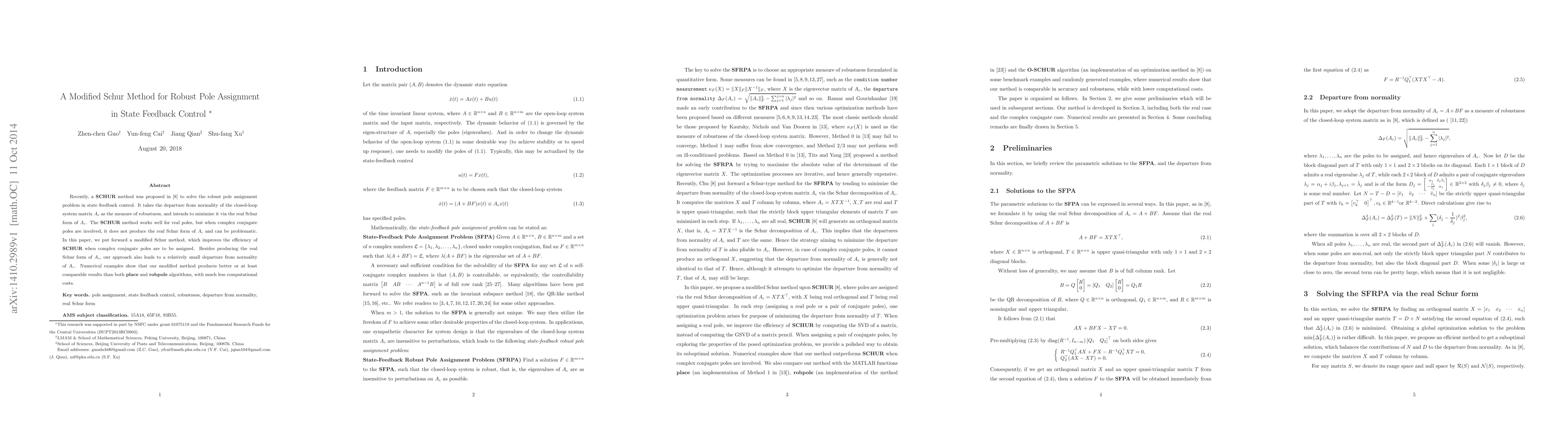 The proposed method is novel in that it uses a real Schur form of the closed-loop system matrix and tends to minimize its departure from normality by solving standard eigenvalue problems.