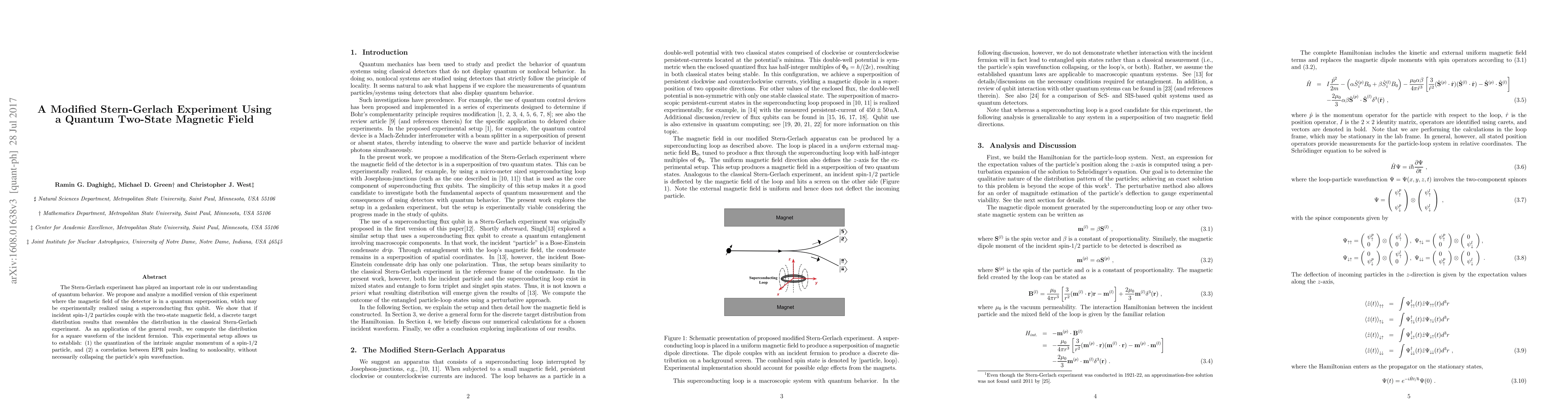 Summary: This paper proposes a modified Stern-Gerlach experiment using a quantum two-state magnetic field realized with a superconducting flux qubit, showing that it produces a discrete target distribution similar to the classical experiment. The setup demonstrates quantization of spin-$1/2$ particles and nonlocal correlations without wavefunction collapse.