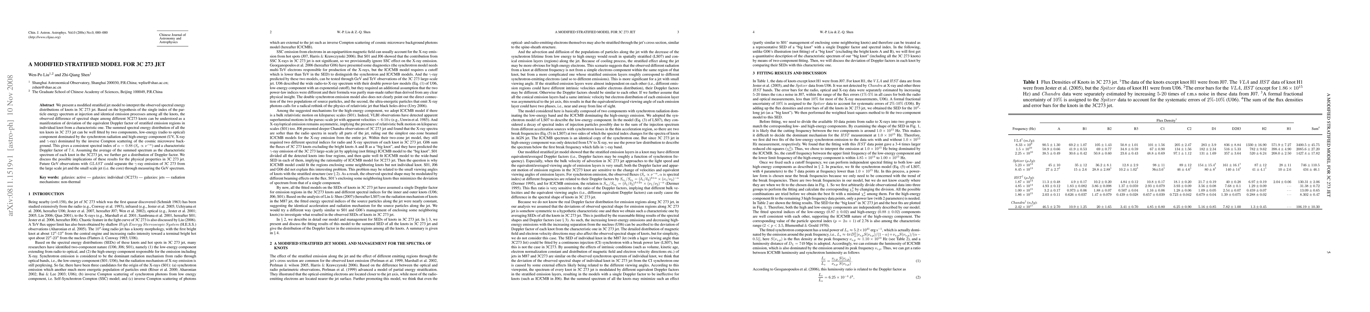 This paper proposes a modified stratified jet model to explain the spectral energy distributions of knots in 3C 273's jet, attributing differences in spectral shape to variations in Doppler factors among emission regions. The study fits the summed spectrum of ten knots with two components, confirming a consistent spectral index and a characteristic Doppler factor.