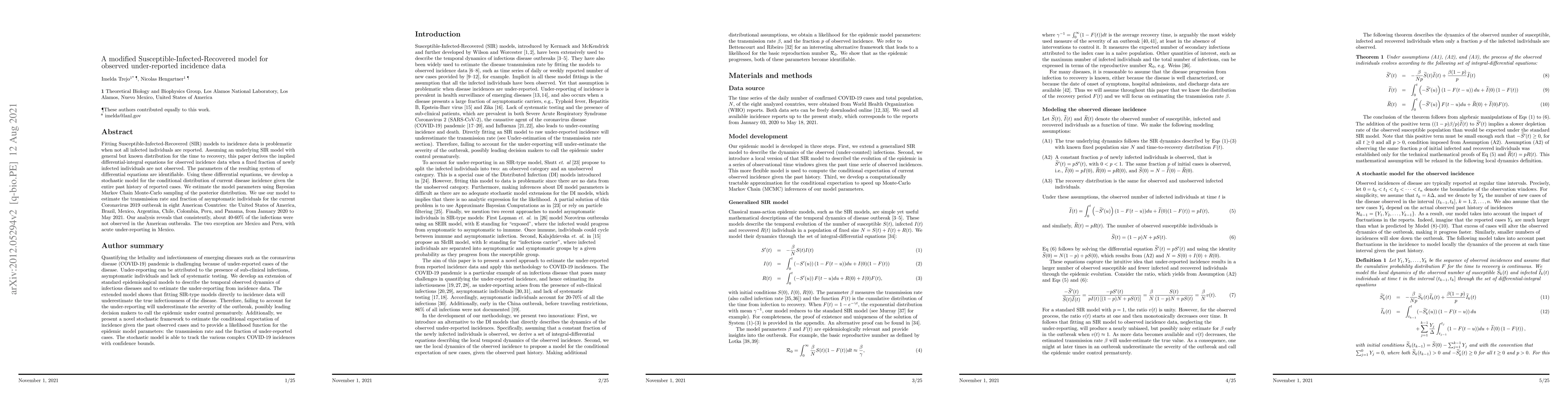 Fitting Susceptible-Infected-Recovered (SIR) models to incidence data is problematic when not all infected individuals are reported. Assuming an underlying SIR model with general but known distribution for the time to recovery, this paper derives the implied differential-integral equations for observed incidence data when a fixed fraction of newly infected individuals are not observed. The parameters of the resulting system of differential equations are identifiable. Using these differential equations, we develop a stochastic model for the conditional distribution of current disease incidence given the entire past history of reported cases. We estimate the model parameters using Bayesian Markov Chain Monte-Carlo sampling of the posterior distribution. We use our model to estimate the transmission rate and fraction of asymptomatic individuals for the current Coronavirus 2019 outbreak in eight American Countries: the United States of America, Brazil, Mexico, Argentina, Chile, Colombia, Peru, and Panama, from January 2020 to May 2021. Our analysis reveals that consistently, about 40-60% of the infections were not observed in the American outbreaks. The two exception are Mexico and Peru, with acute under-reporting in Mexico.