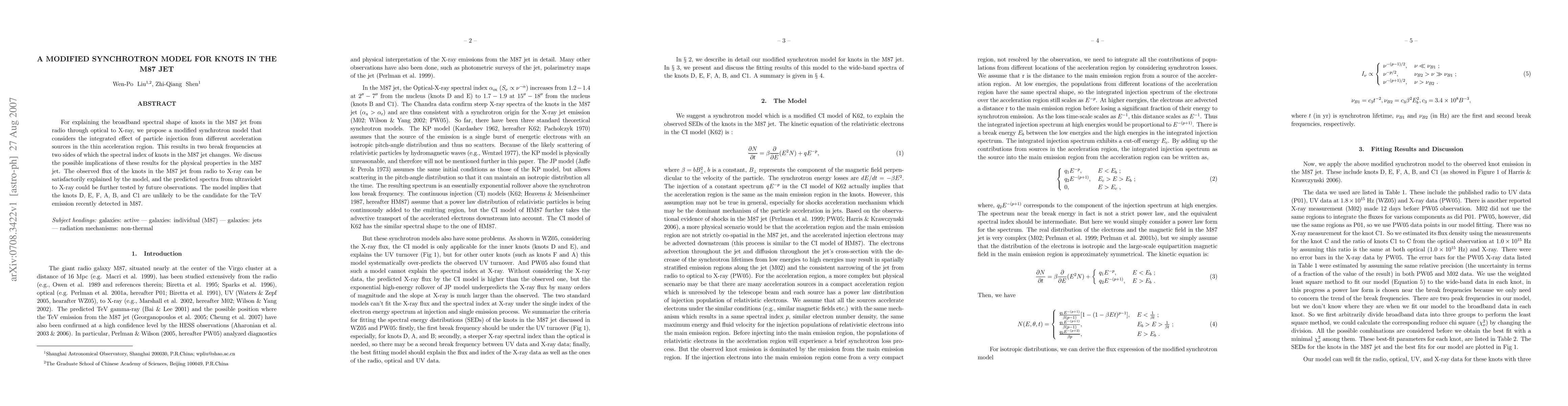 This paper proposes a modified synchrotron model to explain the broadband spectrum of knots in the M87 jet, considering particle injection from multiple acceleration sources. The model successfully fits observed flux from radio to X-ray and suggests that knots D, E, F, A, B, and C1 are unlikely sources of recent TeV emissions.