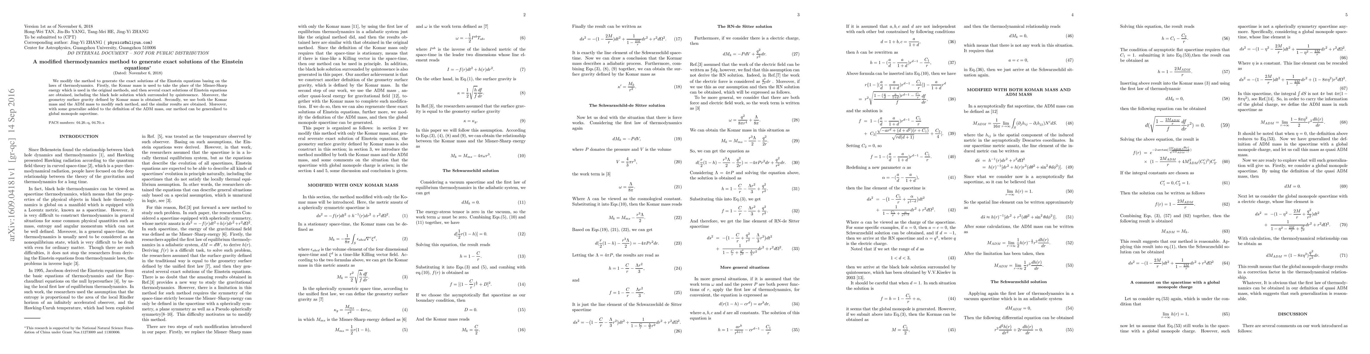 We modify the method to generate the exact solutions of the Einstein equations basing on the laws of thermodynamics. Firstly, the Komar mass is used to take the place of the Misner-Sharp energy which is used in the original methods, and then several exact solutions of Einstein equations are obtained, including the black hole solution which surrounded by quintessence. Moreover, the geometry surface gravity defined by Komar mass is obtained. Secondly, we use both the Komar mass and the ADM mass to modify such method, and the similar results are obtained. Moreover, with some generalize added to the definition of the ADM mass, our method can be generalized to global monopole sapcetime.