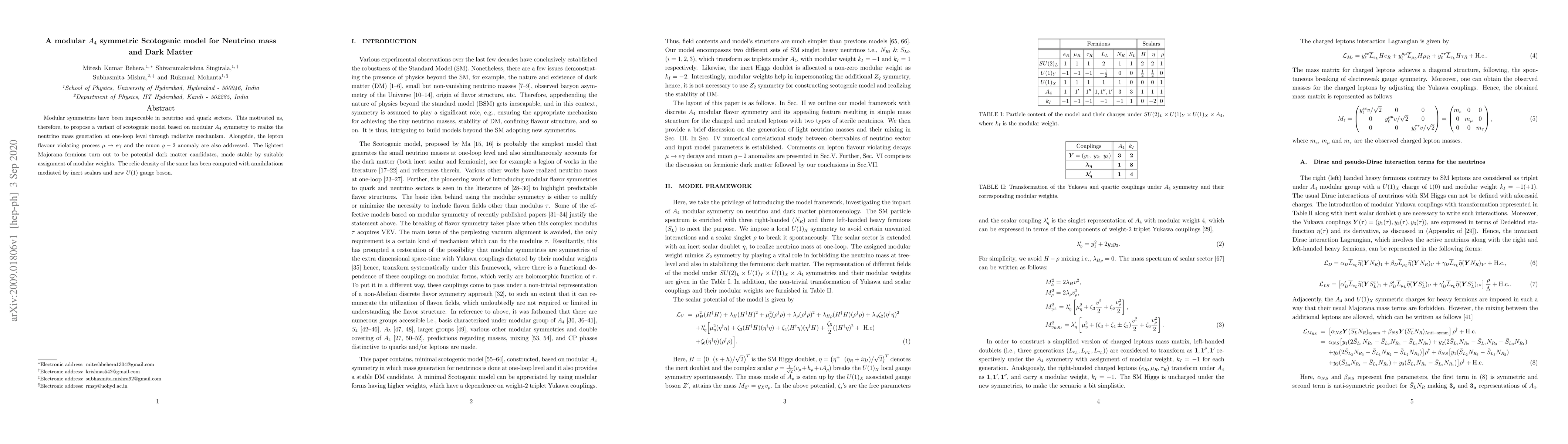This paper proposes a scotogenic model based on modular $A_4$ symmetry for one-loop neutrino mass generation, addressing $\mu \to e \gamma$ and muon $g-2$ anomaly. The lightest Majorana fermions, stabilized by modular weights, serve as potential dark matter, with relic density computed via annihilations mediated by inert scalars and a new $U(1)$ gauge boson.
