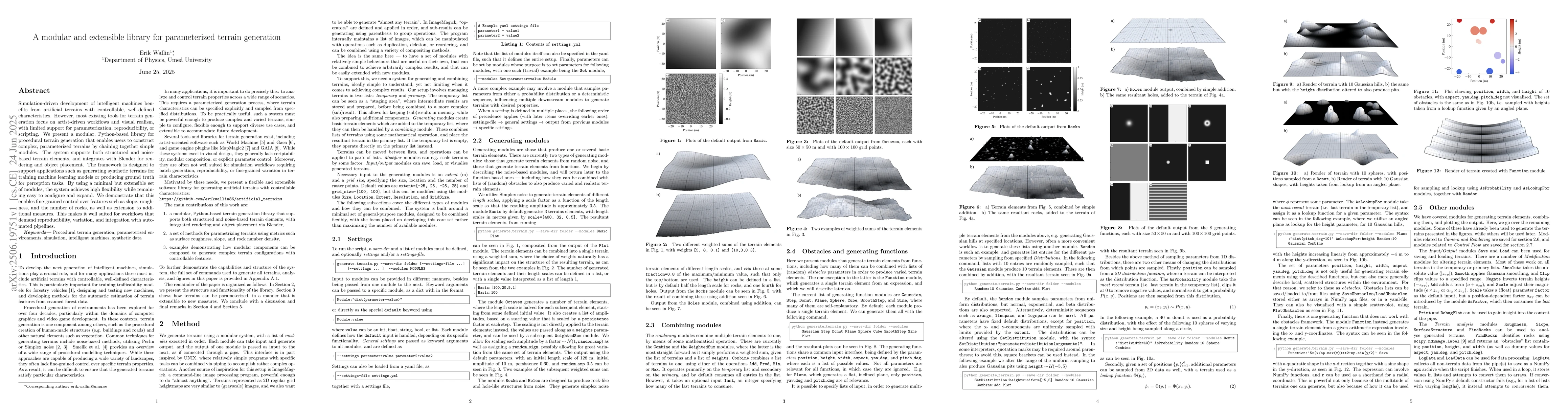 This paper introduces a Python-based library for generating customizable terrains via modular components, enabling precise control over features like slope and rock distribution. It integrates with Blender and is suitable for creating synthetic terrains for machine learning and perception tasks, offering flexibility, reproducibility, and extensibility.