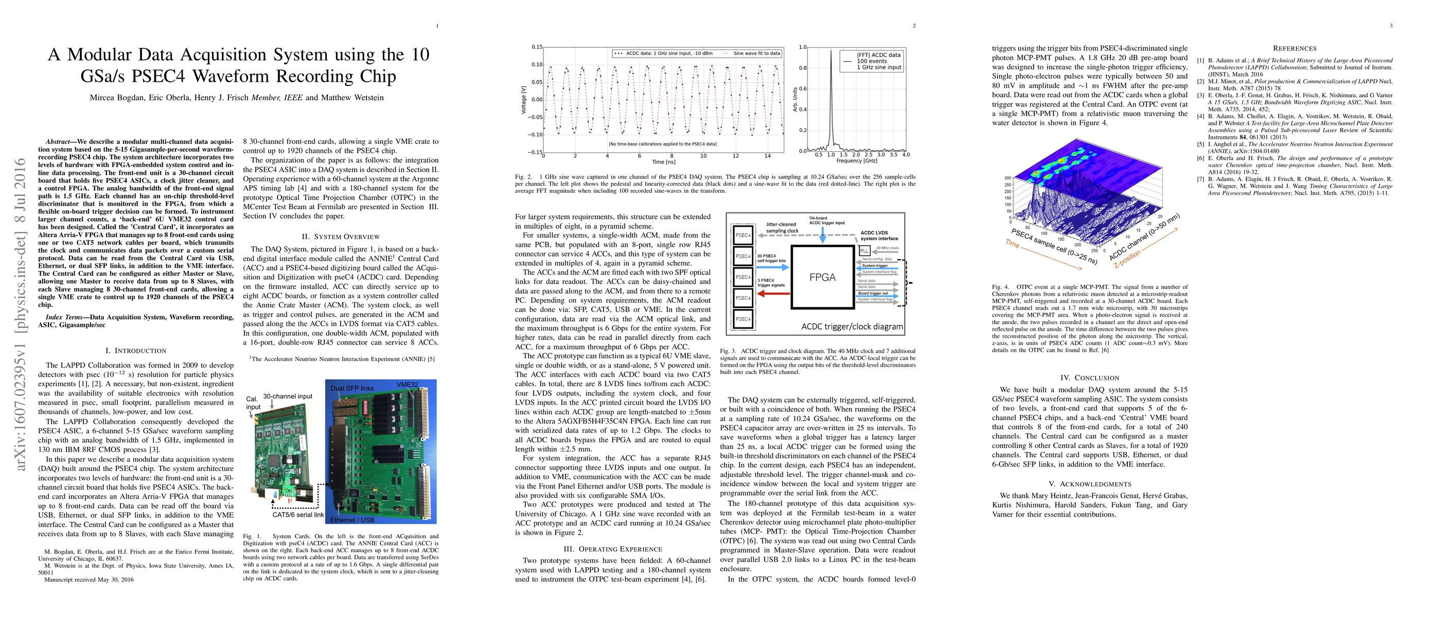 We describe a modular multi-channel data acquisition system based on the 5-15 Gigasample-per-second waveform-recording PSEC4 chip. The system architecture incorporates two levels of hardware with FPGA-embedded system control and in-line data processing. The front-end unit is a 30-channel circuit board that holds five PSEC4 ASICs, a clock jitter cleaner, and a control FPGA. The analog bandwidth of the front-end signal path is 1.5 GHz. Each channel has an on-chip threshold-level discriminator that is monitored in the FPGA, from which a flexible on-board trigger decision can be formed. To instrument larger channel counts, a `back-end' 6U VME32 control card has been designed. Called the 'Central Card', it incorporates an Altera Arria-V FPGA that manages up to 8 front-end cards using one or two CAT5 network cables per board, which transmits the clock and communicates data packets over a custom serial protocol. Data can be read from the Central Card via USB, Ethernet, or dual SFP links, in addition to the VME interface. The Central Card can be configured as either Master or Slave, allowing one Master to receive data from up to 8 Slaves, with each Slave managing 8 30-channel front-end cards, allowing a single VME crate to control up to 1920 channels of the PSEC4 chip.