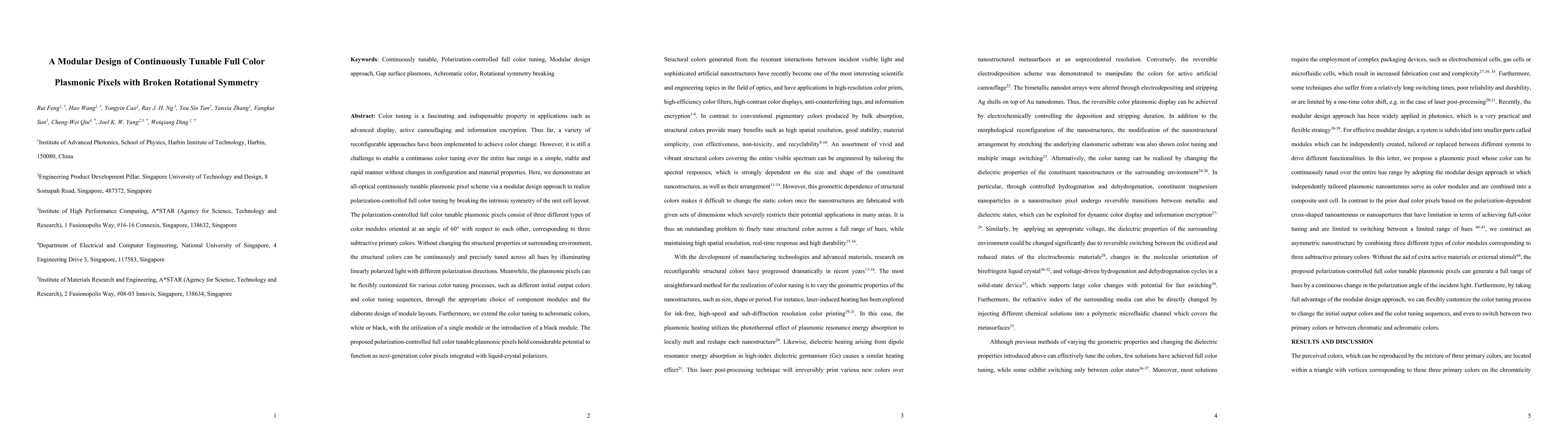 Researchers developed a modular design for continuously tunable full-color plasmonic pixels that can change colors without changing configuration or material properties.