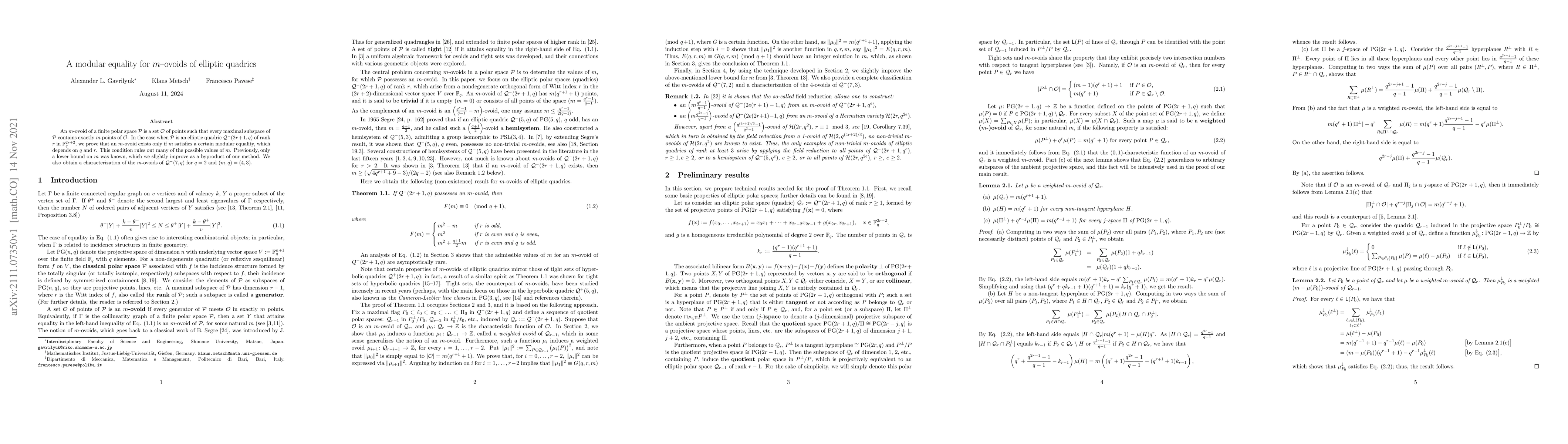Researchers proved that an m-ovoid of an elliptic quadric exists only if m satisfies a modular equality depending on the finite field q and the rank r, ruling out many possible values of m.