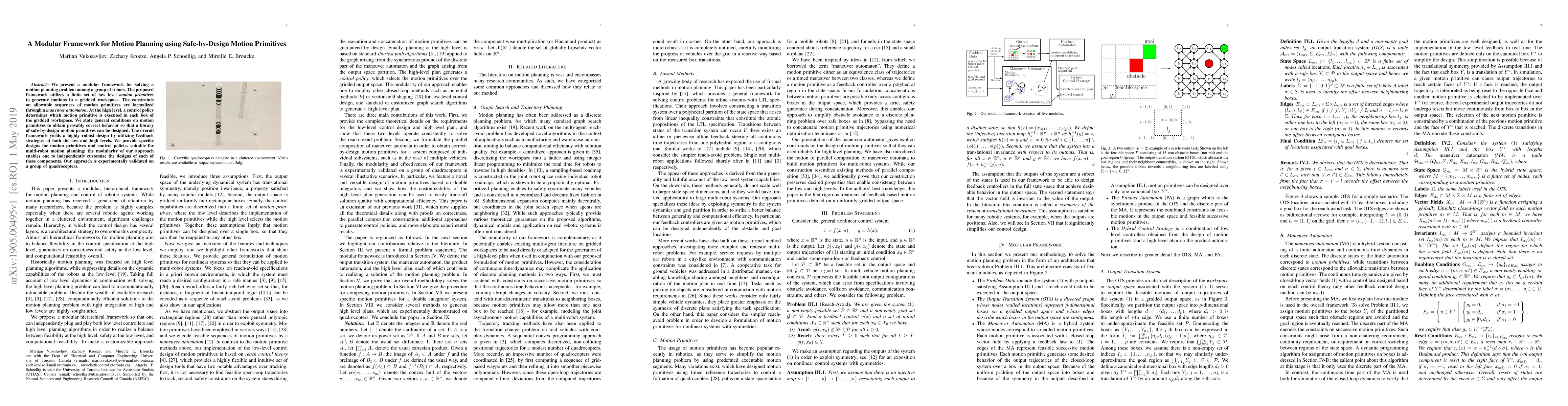 This paper introduces a modular framework for multi-robot motion planning that uses safe-by-design motion primitives and a maneuver automaton to formalize constraints. The framework ensures robust and correct behavior through feedback strategies and is validated experimentally with quadrocopters.