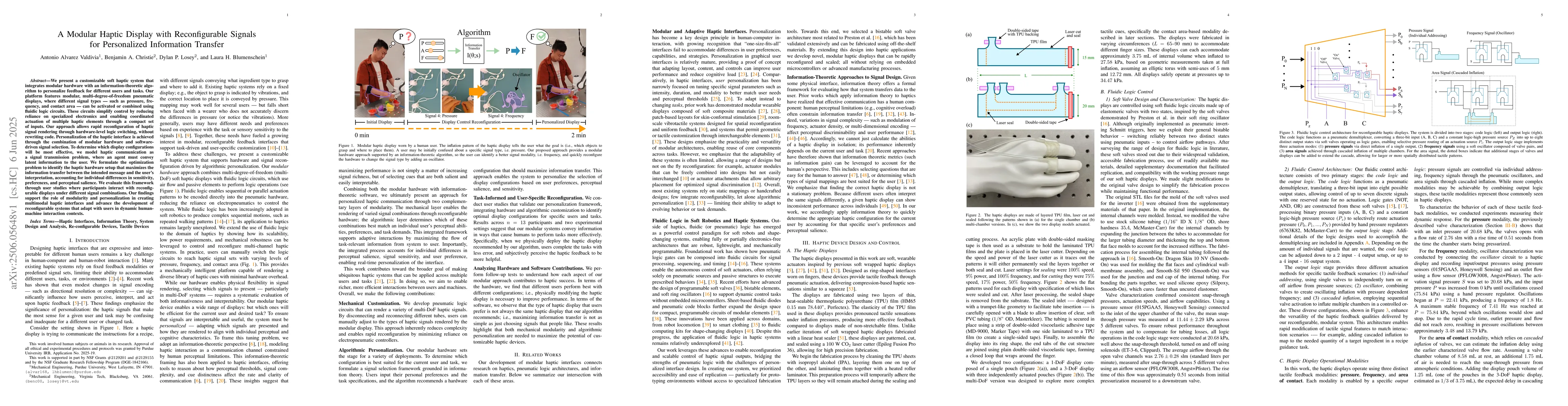 We present a customizable soft haptic system that integrates modular hardware with an information-theoretic algorithm to personalize feedback for different users and tasks. Our platform features modular, multi-degree-of-freedom pneumatic displays, where different signal types, such as pressure, frequency, and contact area, can be activated or combined using fluidic logic circuits. These circuits simplify control by reducing reliance on specialized electronics and enabling coordinated actuation of multiple haptic elements through a compact set of inputs. Our approach allows rapid reconfiguration of haptic signal rendering through hardware-level logic switching without rewriting code. Personalization of the haptic interface is achieved through the combination of modular hardware and software-driven signal selection. To determine which display configurations will be most effective, we model haptic communication as a signal transmission problem, where an agent must convey latent information to the user. We formulate the optimization problem to identify the haptic hardware setup that maximizes the information transfer between the intended message and the user's interpretation, accounting for individual differences in sensitivity, preferences, and perceptual salience. We evaluate this framework through user studies where participants interact with reconfigurable displays under different signal combinations. Our findings support the role of modularity and personalization in creating multimodal haptic interfaces and advance the development of reconfigurable systems that adapt with users in dynamic human-machine interaction contexts.