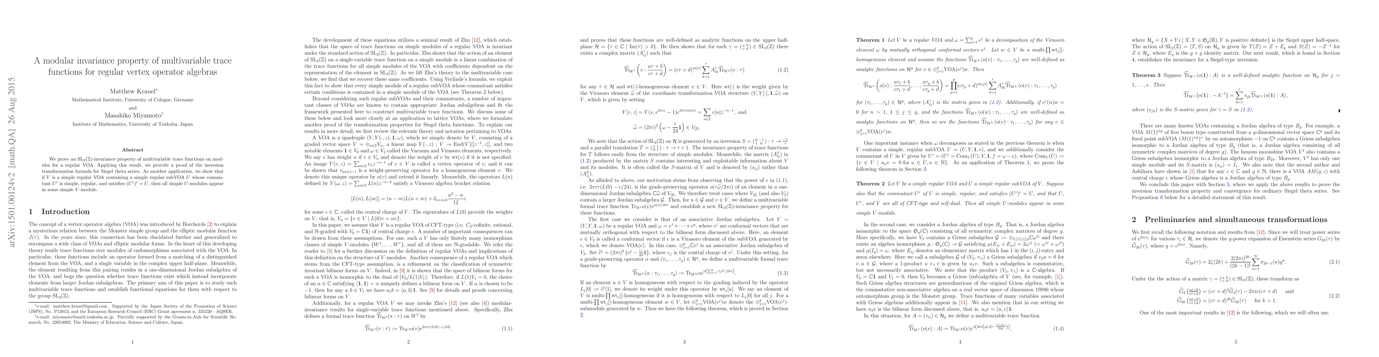 We prove an $\text{SL}_2 (\mathbb{Z})$-invariance property of multivariable trace functions on modules for a regular VOA. Applying this result, we provide a proof of the inversion transformation formula for Siegel theta series. As another application, we show that if $V$ is a regular VOA containing a regular subVOA $U$ whose commutant $U^c$ is regular and satisfies $(U^c)^c =U$, then all simple $U$-modules appear in some simple $V$-module.