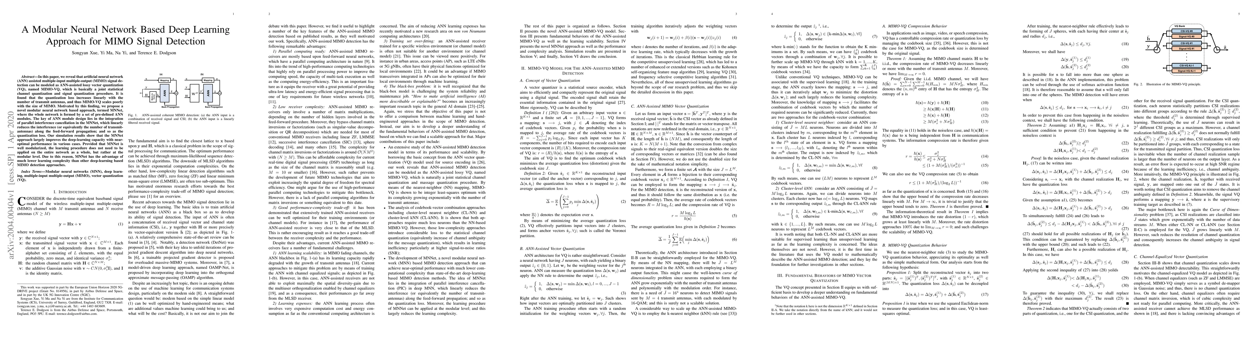 This paper proposes a modular neural network (MNNet) approach for MIMO signal detection, which models ANN-assisted MIMO detection as MIMO-VQ. The MNNet integrates parallel interference cancellation to reduce quantization loss and interference, achieving near-optimal performance with lower learning complexity compared to traditional deep-learning methods.