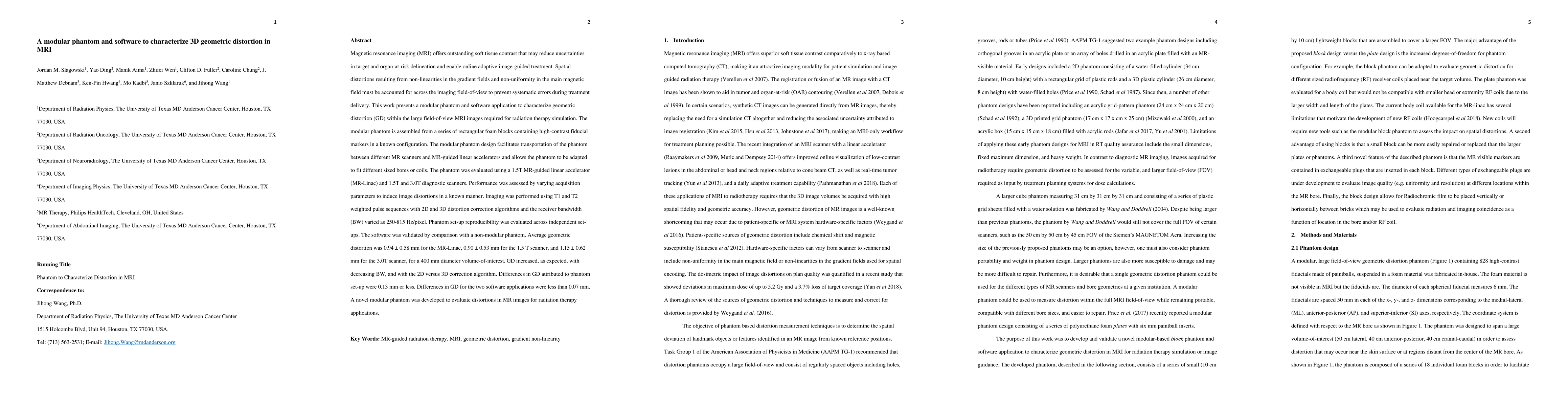 Researchers developed a modular phantom to measure geometric distortion in MRI images, finding that 3T scanners had larger distortions than 1.5T scanners, and software application showed minor differences in distortion measurements between the two.