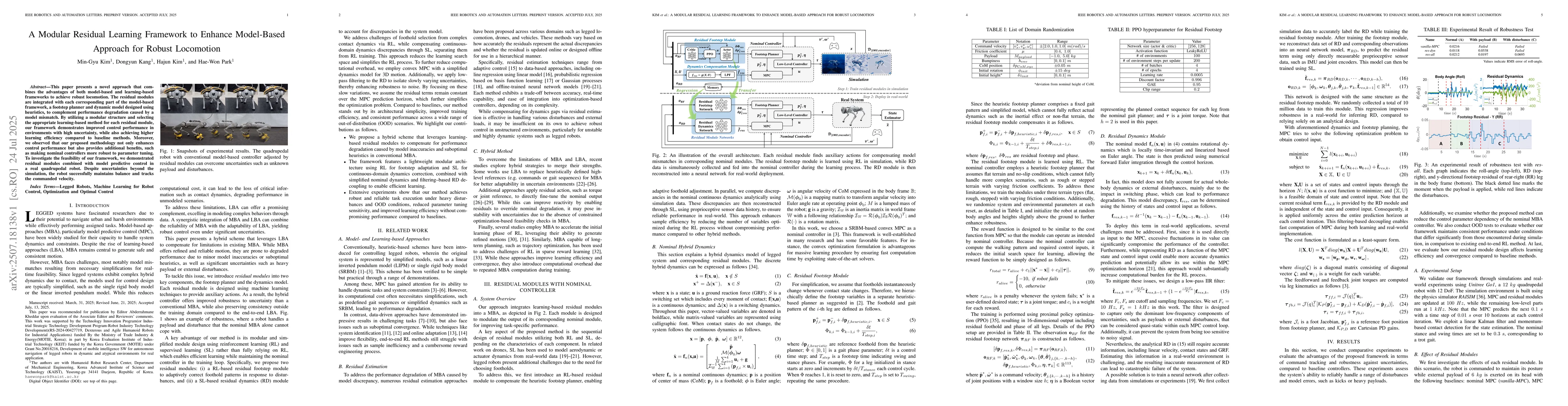 This paper presents a novel approach that combines the advantages of both model-based and learning-based frameworks to achieve robust locomotion. The residual modules are integrated with each corresponding part of the model-based framework, a footstep planner and dynamic model designed using heuristics, to complement performance degradation caused by a model mismatch. By utilizing a modular structure and selecting the appropriate learning-based method for each residual module, our framework demonstrates improved control performance in environments with high uncertainty, while also achieving higher learning efficiency compared to baseline methods. Moreover, we observed that our proposed methodology not only enhances control performance but also provides additional benefits, such as making nominal controllers more robust to parameter tuning. To investigate the feasibility of our framework, we demonstrated residual modules combined with model predictive control in a real quadrupedal robot. Despite uncertainties beyond the simulation, the robot successfully maintains balance and tracks the commanded velocity.