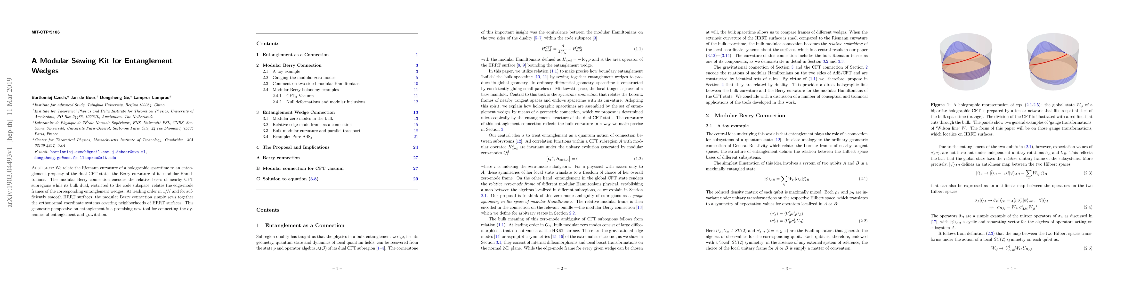 The paper introduces a modular sewing kit framework for entanglement wedges, linking modular Hamiltonians' Berry curvature to the Riemann curvature of holographic spacetimes.
