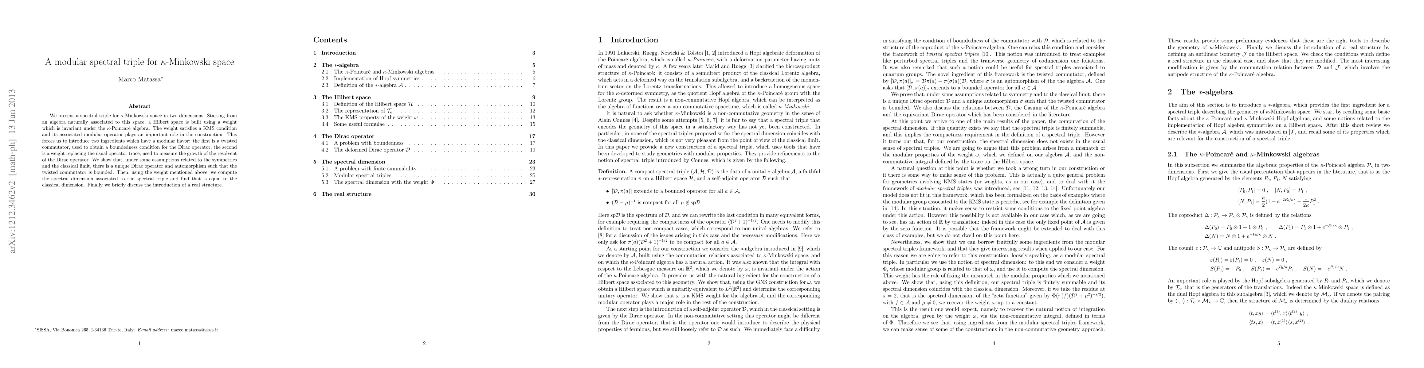 We present a spectral triple for $\kappa$-Minkowski space in two dimensions. Starting from an algebra naturally associated to this space, a Hilbert space is built using a weight which is invariant under the $\kappa$-Poincar\'e algebra. The weight satisfies a KMS condition and its associated modular operator plays an important role in the construction. This forces us to introduce two ingredients which have a modular flavor: the first is a twisted commutator, used to obtain a boundedness condition for the Dirac operator, the second is a weight replacing the usual operator trace, used to measure the growth of the resolvent of the Dirac operator. We show that, under some assumptions related to the symmetries and the classical limit, there is a unique Dirac operator and automorphism such that the twisted commutator is bounded. Then, using the weight mentioned above, we compute the spectral dimension associated to the spectral triple and find that is equal to the classical dimension. Finally we briefly discuss the introduction of a real structure.