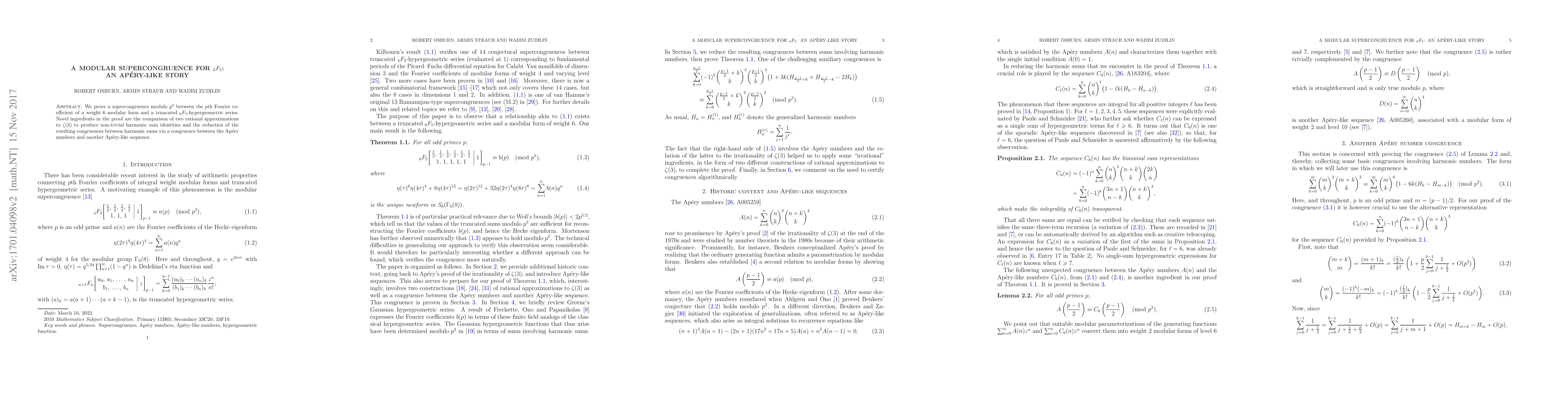 We prove a supercongruence modulo $p^3$ between the $p$th Fourier coefficient of a weight 6 modular form and a truncated ${}_6F_5$-hypergeometric series. Novel ingredients in the proof are the comparison of two rational approximations to $\zeta (3)$ to produce non-trivial harmonic sum identities and the reduction of the resulting congruences between harmonic sums via a congruence between the Ap\'ery numbers and another Ap\'ery-like sequence.