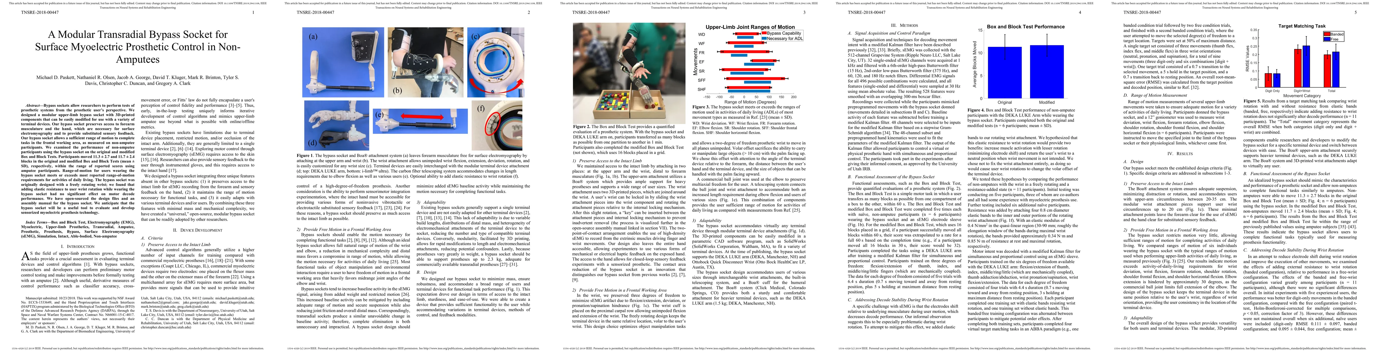 Bypass sockets allow researchers to perform tests of prosthetic systems from the prosthetic user's perspective. We designed a modular upper-limb bypass socket with 3D-printed components that can be easily modified for use with a variety of terminal devices. Our bypass socket preserves access to forearm musculature and the hand, which are necessary for surface electromyography and to provide substituted sensory feedback. Our bypass socket allows a sufficient range of motion to complete tasks in the frontal working area, as measured on non-amputee participants. We examined the performance of non-amputee participants using the bypass socket on the original and modified Box and Block Tests. Participants moved 11.3 +/- 2.7 and 11.7 +/- 2.4 blocks in the original and modified Box and Block Tests (mean +/- SD), respectively, within the range of reported scores using amputee participants. Range-of-motion for users wearing the bypass socket meets or exceeds most reported range-of-motion requirements for activities of daily living. The bypass socket was originally designed with a freely rotating wrist; we found that adding elastic resistance to user wrist rotation while wearing the bypass socket had no significant effect on motor decode performance. We have open-sourced the design files and an assembly manual for the bypass socket. We anticipate that the bypass socket will be a useful tool to evaluate and develop sensorized myoelectric prosthesis technology.