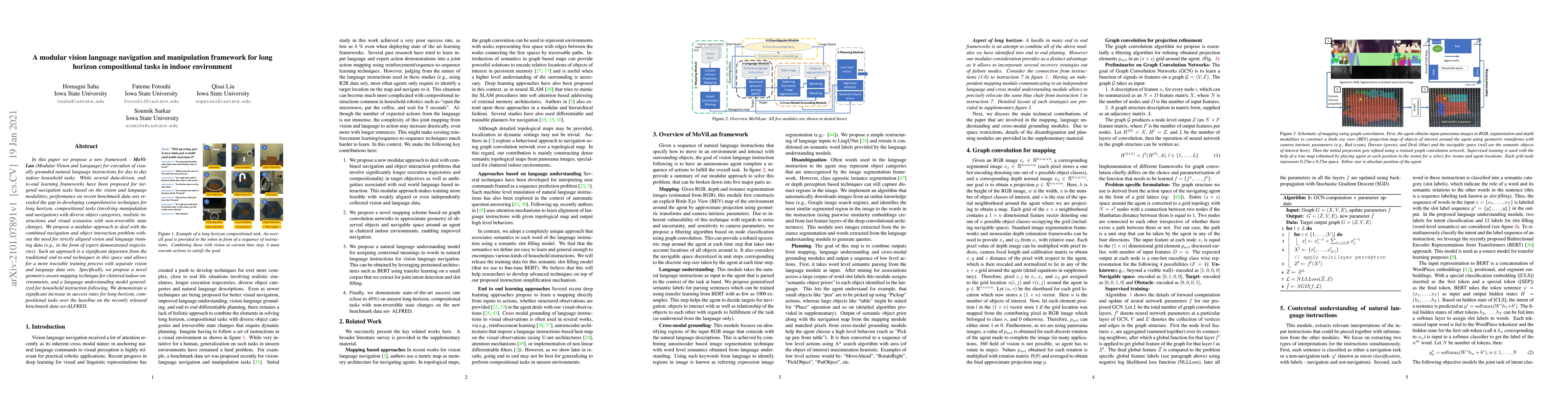 This paper presents MoViLan, a modular framework for executing visually grounded natural language instructions for indoor household tasks, addressing long horizon compositional tasks. It introduces a geometry-aware mapping technique and a generalized language model, showing improved performance on long-horizon, compositional tasks compared to baselines.