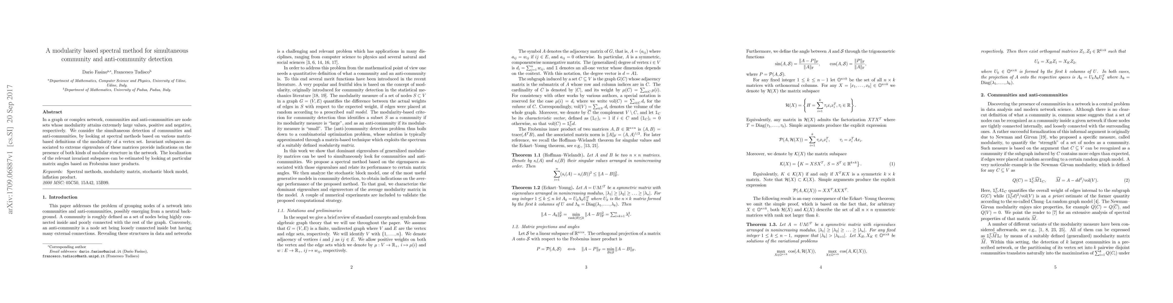 The paper proposes a spectral method for simultaneous detection of communities and anti-communities in networks by analyzing the modularity matrix's extreme eigenvalues and their associated invariant subspaces, estimated via Frobenius inner products.