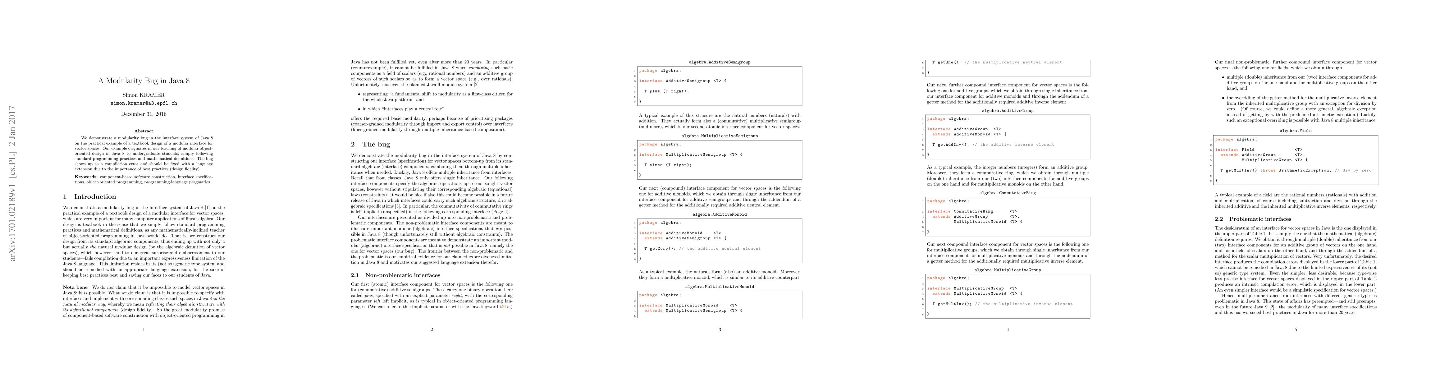 We demonstrate a modularity bug in the interface system of Java 8 on the practical example of a textbook design of a modular interface for vector spaces. Our example originates in our teaching of modular object-oriented design in Java 8 to undergraduate students, simply following standard programming practices and mathematical definitions. The bug shows up as a compilation error and should be fixed with a language extension due to the importance of best practices (design fidelity).
