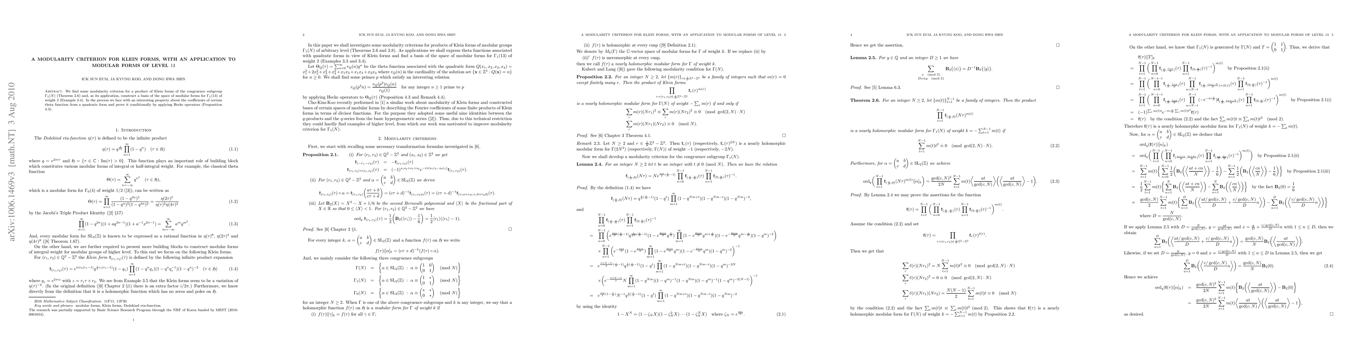 We find some modularity criterion for a product of Klein forms of the congruence subgroup $\Gamma_1(N)$ and, as its application, construct a basis of the space of modular forms for $\Gamma_1(13)$ of weight $2$. In the process we face with an interesting property about the coefficients of certain theta function from a quadratic form and prove it conditionally by applying Hecke operators.