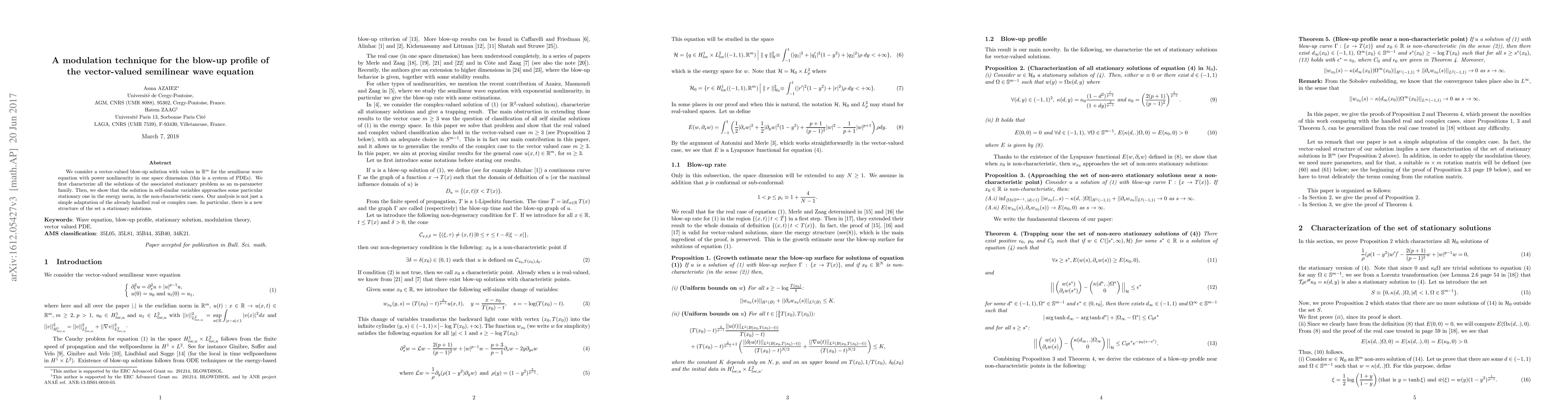 **Summary:** This paper investigates vector-valued blow-up solutions for a semilinear wave equation with power nonlinearity. It characterizes stationary solutions as an m-parameter family and demonstrates that self-similar solutions converge to specific stationary solutions in the energy norm, introducing a new structure for the set of stationary solutions.