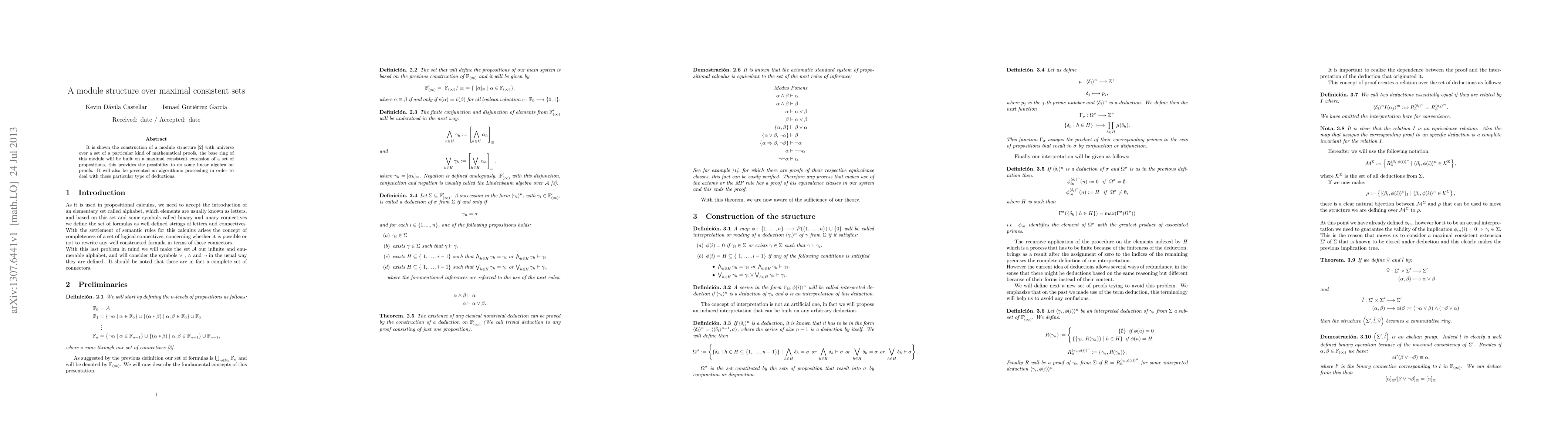 It is shown the construction of a module structure [2] with universe over a set of a particular kind of mathematical proofs, the base ring of this module will be built on a maximal consistent extension of a set of propositions, this provides the possibility to do some linear algebra on proofs. It will also be presented an algorithmic proceeding in order to deal with these particular type of deductions.