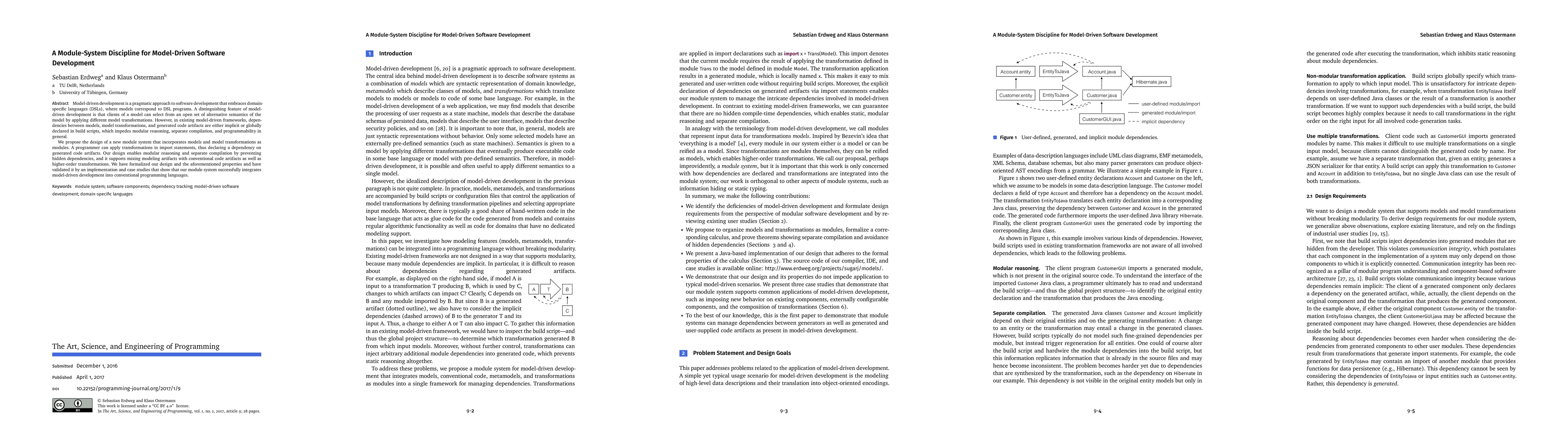 Model-driven development is a pragmatic approach to software development that embraces domain-specific languages (DSLs), where models correspond to DSL programs. A distinguishing feature of model-driven development is that clients of a model can select from an open set of alternative semantics of the model by applying different model transformation. However, in existing model-driven frameworks, dependencies between models, model transformations, and generated code artifacts are either implicit or globally declared in build scripts, which impedes modular reasoning, separate compilation, and programmability in general. We propose the design of a new module system that incorporates models and model transformations as modules. A programmer can apply transformations in import statements, thus declaring a dependency on generated code artifacts. Our design enables modular reasoning and separate compilation by preventing hidden dependencies, and it supports mixing modeling artifacts with conventional code artifacts as well as higher-order transformations. We have formalized our design and the aforementioned properties and have validated it by an implementation and case studies that show that our module system successfully integrates model-driven development into conventional programming languages.