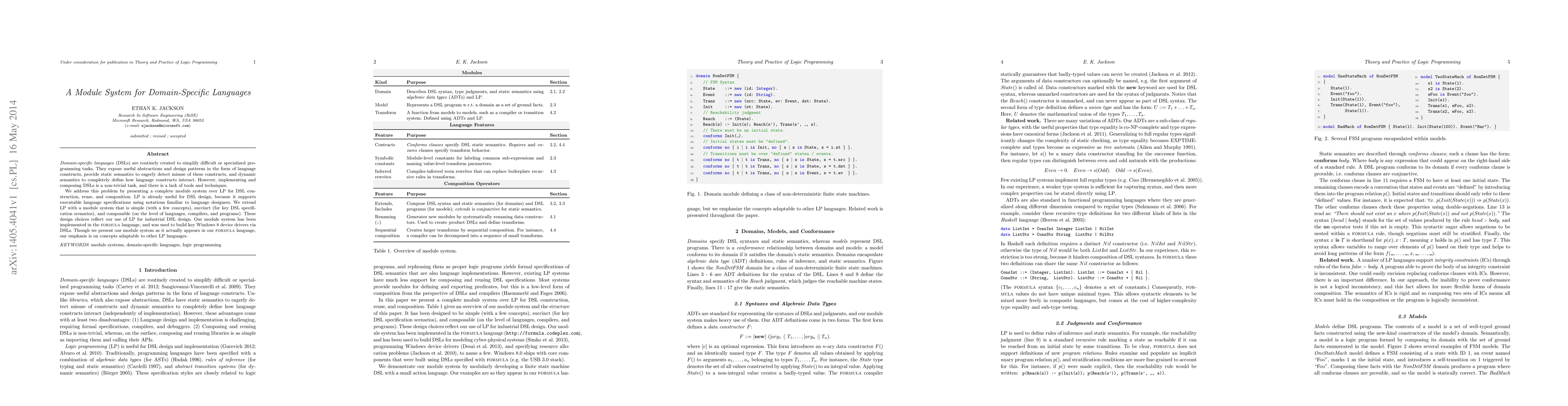 This paper presents a module system for implementing, reusing, and composing domain-specific languages (DSLs) using the LP language, which simplifies DSL design. The module system is simple, succinct, and composable, aiding in industrial DSL development, as demonstrated in building Windows 8 device drivers.