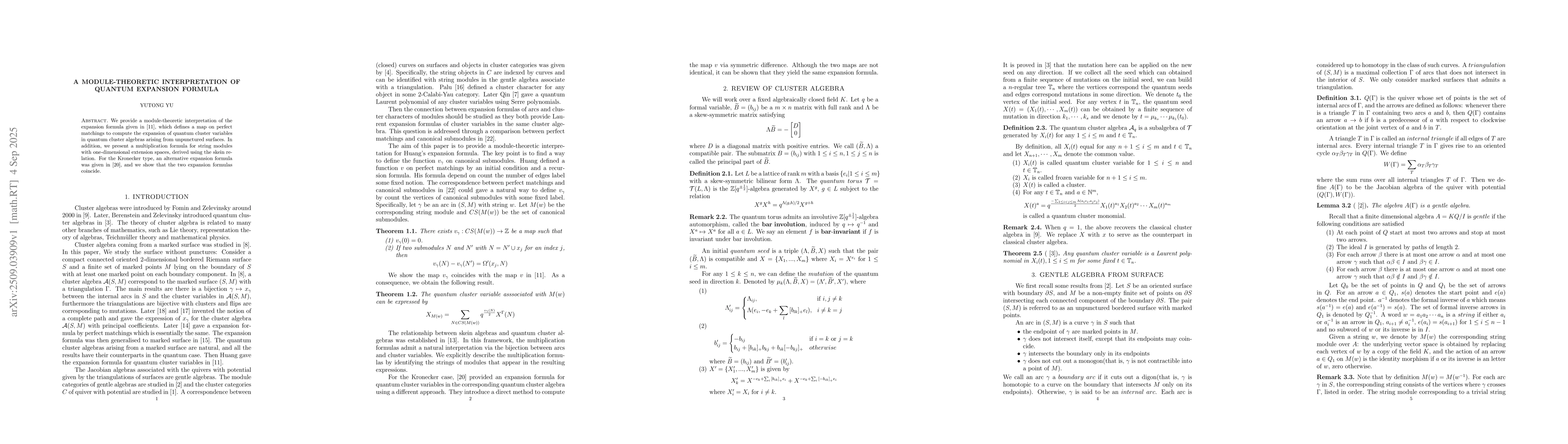 We provide a module-theoretic interpretation of the expansion formula given in [11], which defines a map on perfect matchings to compute the expansion of quantum cluster variables in quantum cluster algebras arising from unpunctured surfaces. In addition, we present a multiplication formula for string modules with one-dimensional extension spaces, derived using the skein relation. For the Kronecker type, an alternative expansion formula was given in [20], and we show that the two expansion formulas coincide.