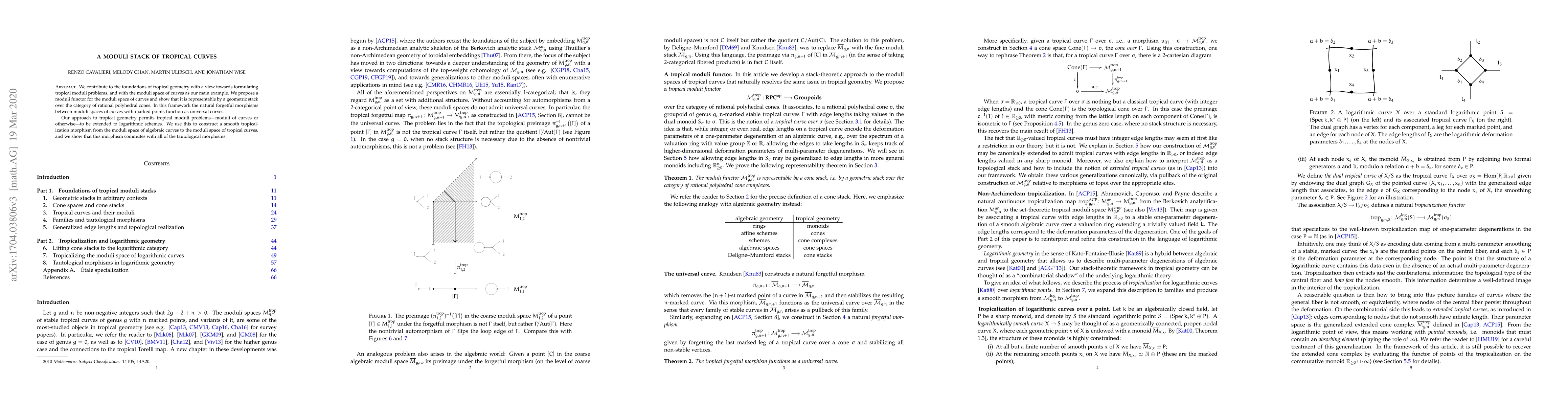 The paper establishes a moduli stack for tropical curves using a functor that is represented by a geometric stack over rational polyhedral cones, enabling the extension of tropical moduli problems to logarithmic schemes and constructing a smooth tropicalization morphism between moduli spaces of algebraic and tropical curves.