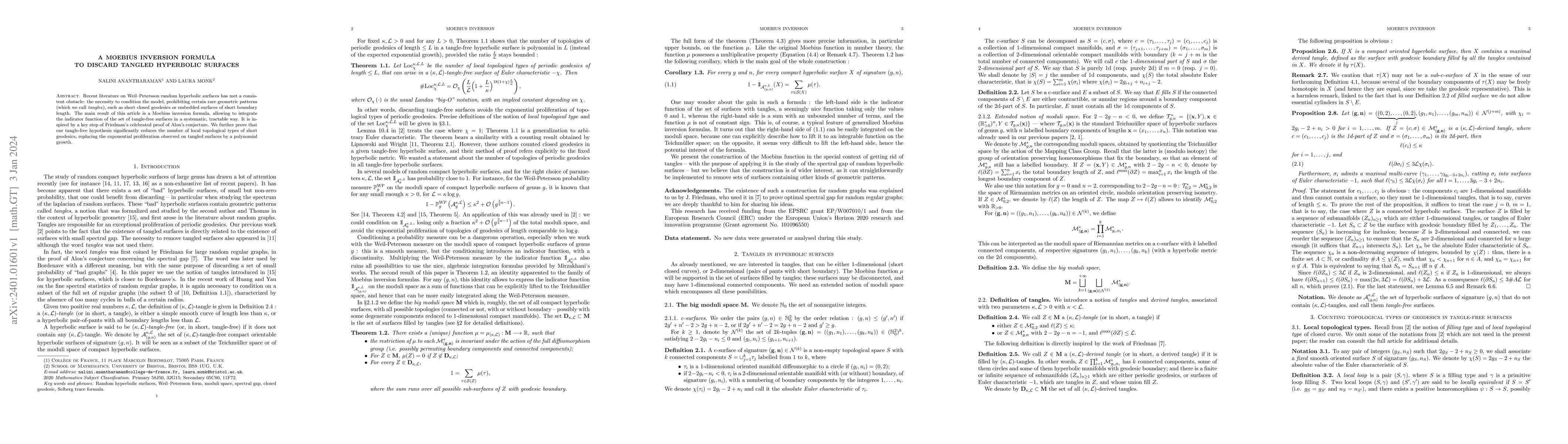 This paper presents a Moebius inversion formula to systematically discard tangled hyperbolic surfaces, allowing for the integration of the indicator function of tangle-free surfaces. The formula significantly reduces the number of local topological types of short geodesics, replacing exponential growth on tangled surfaces with polynomial growth.