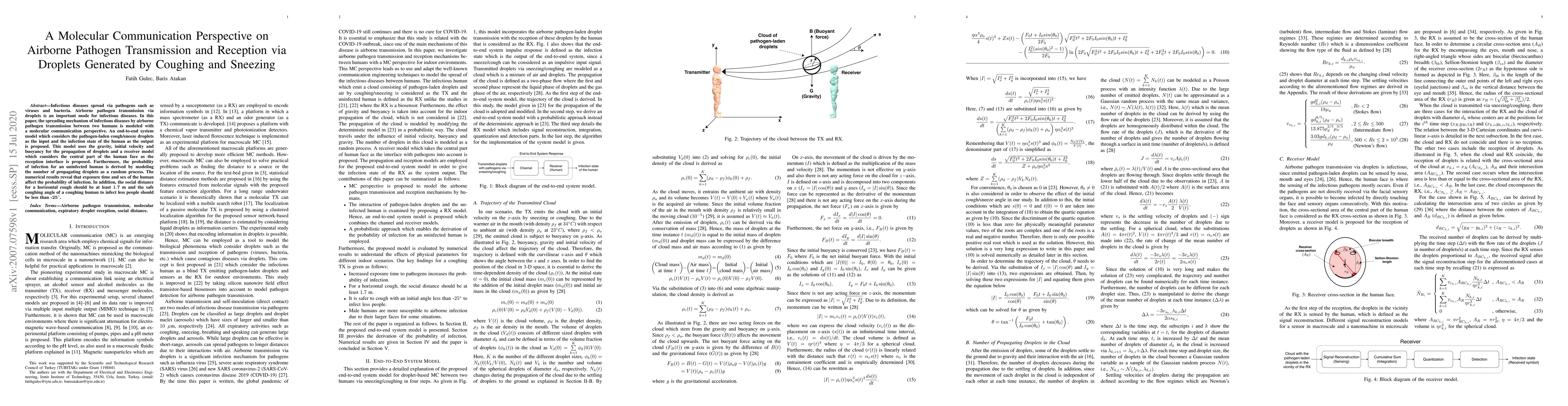 This paper models airborne pathogen transmission through cough/sneeze droplets using a molecular communication framework, proposing a system model that considers droplet propagation and reception on human faces. The study finds that exposure time, sex, and social distancing significantly affect infection probability, recommending a minimum 1.7 m distance for horizontal coughs and a safe coughing angle below -25° to minimize infection spread.