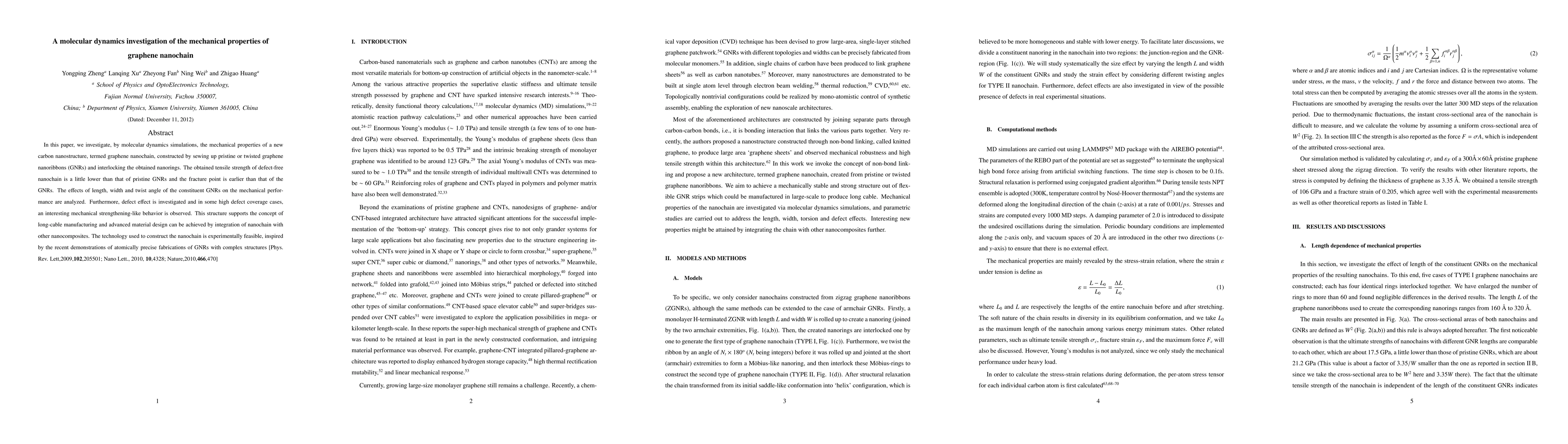This paper uses molecular dynamics simulations to explore the mechanical properties of graphene nanochains, finding that their tensile strength is slightly lower than that of pristine graphene nanoribbons (GNRs) but can exhibit mechanical strengthening under high defect coverage. The study also analyzes how GNR length, width, and twist angle influence the nanochain's performance.