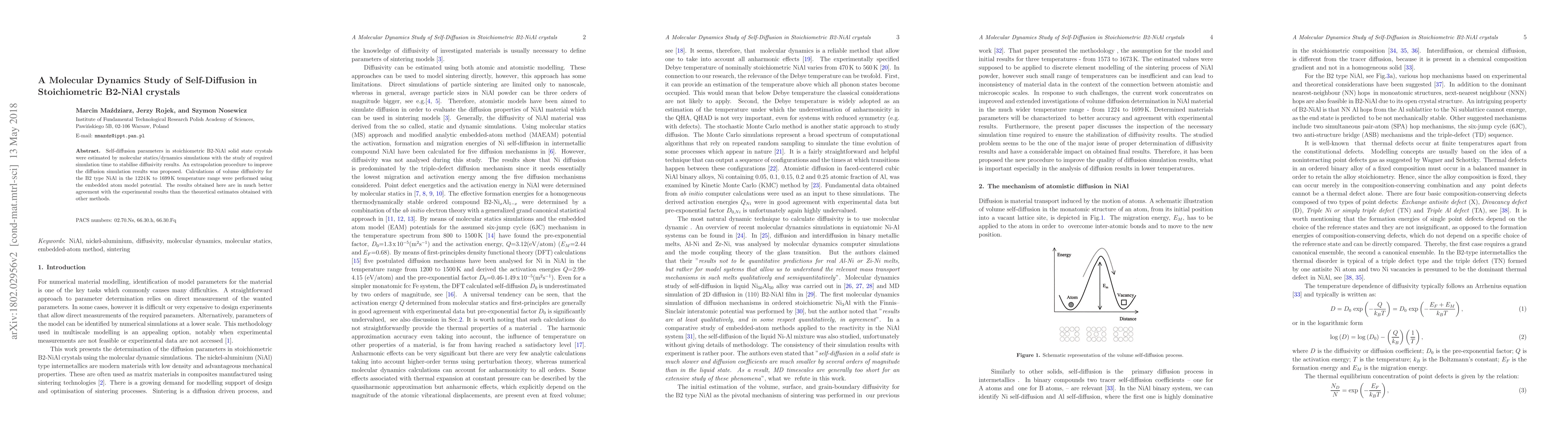 This study uses molecular statics/dynamics simulations to estimate self-diffusion parameters in stoichiometric B2-NiAl crystals, proposing an extrapolation method to stabilize diffusivity results. The embedded atom model potential was applied to calculate volume diffusivity, yielding results that better match experimental data compared to other theoretical estimates.