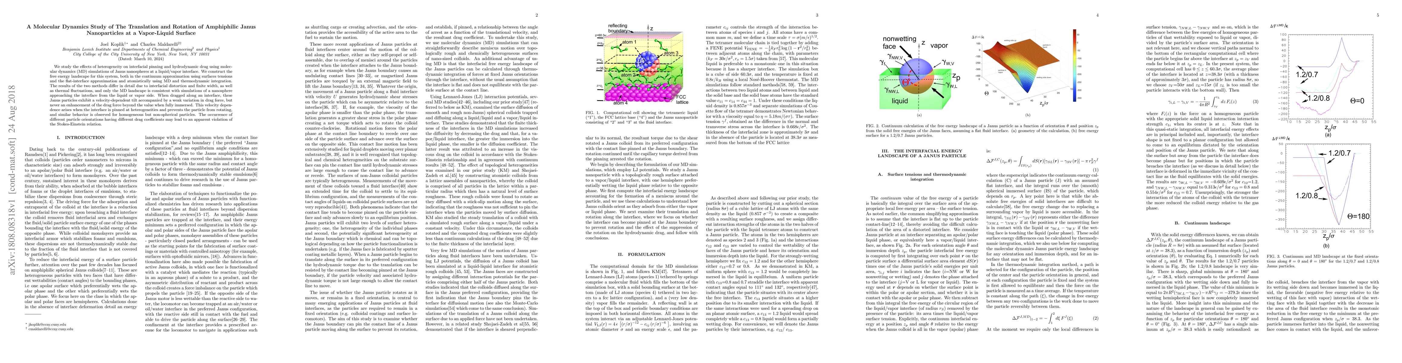 This study uses molecular dynamics simulations to explore the translation and rotation of Janus nanoparticles at a liquid-vapor interface, revealing velocity-dependent tilt and drag without exceeding fully immersed drag levels. The research highlights the importance of interfacial pinning and heterogeneity in determining particle behavior.