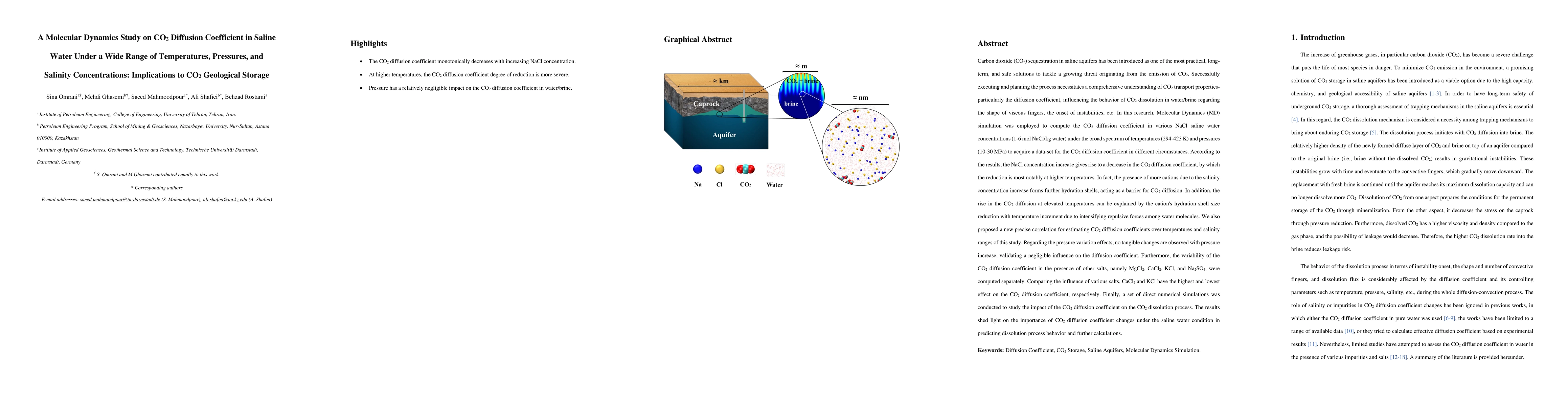 Carbon dioxide (CO$_2$) sequestration in saline aquifers has been introduced as one of the most practical, long-term, and safe solutions to tackle a growing threat originating from the emission of CO$_2$. Successfully executing and planning the process necessitates a comprehensive understanding of CO$_2$ transport properties -- particularly the diffusion coefficient, influencing the behavior of CO$_2$ dissolution in water/brine regarding the shape of viscous fingers, the onset of instabilities, etc. In this research, Molecular Dynamics (MD) simulation was employed to compute the CO$_2$ diffusion coefficient in various NaCl saline water concentrations under the broad spectrum of temperatures and pressures to acquire a data-set. The NaCl concentration increase gives rise to a decrease in the CO$_2$ diffusion coefficient, by which the reduction is most notably at higher temperatures. In addition, the rise in the CO$_2$ diffusion at elevated temperatures can be explained by the cation's hydration shell size reduction with temperature increment due to intensifying repulsive forces among water molecules. A new precise correlation is proposed for estimating CO$_2$ diffusion coefficients. Regarding the pressure variation effects, no tangible changes are observed with pressure increase. Furthermore, the variability of the CO$_2$ diffusion coefficient in the presence of other salts, namely MgCl2, CaCl2, KCl, and Na2SO4, were computed separately. Comparing the influence of various salts, CaCl2 and KCl have the highest and lowest effect on the CO$_2$ diffusion coefficient, respectively. Finally, a set of direct numerical simulations was conducted to study the impact of the CO$_2$ diffusion coefficient on the CO$_2$ dissolution process. The results shed light on the importance of CO$_2$ diffusion coefficient changes under the saline water condition in predicting dissolution process behavior and further calculations.