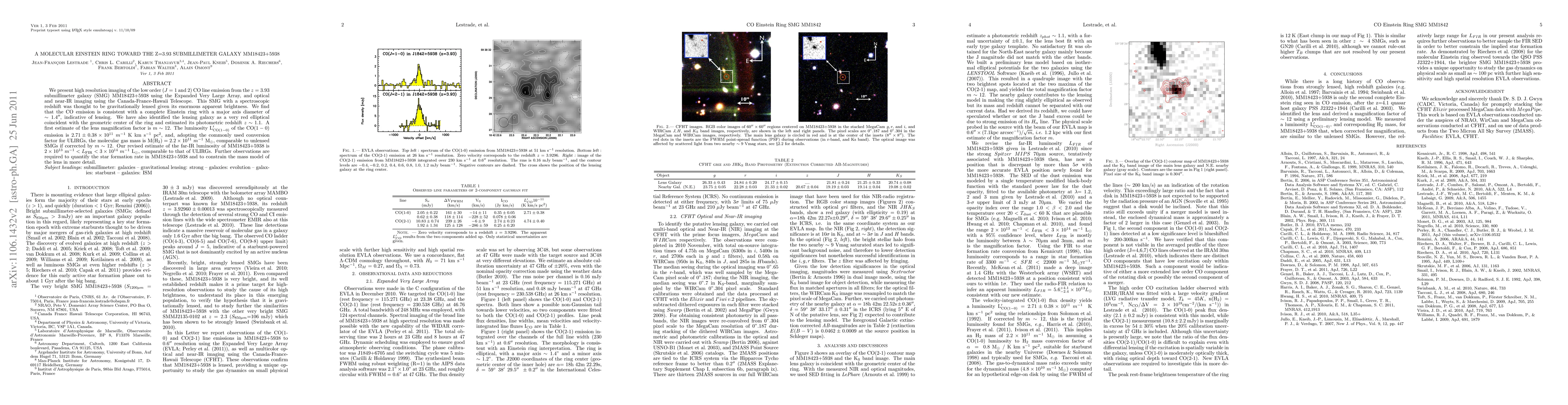 This study reveals a molecular Einstein ring around the z = 3.93 submillimeter galaxy MM18423+5938, indicating gravitational lensing by a nearby red elliptical galaxy. The lensed galaxy's molecular gas mass and far-IR luminosity suggest it is comparable to ultra-luminous infrared galaxies.