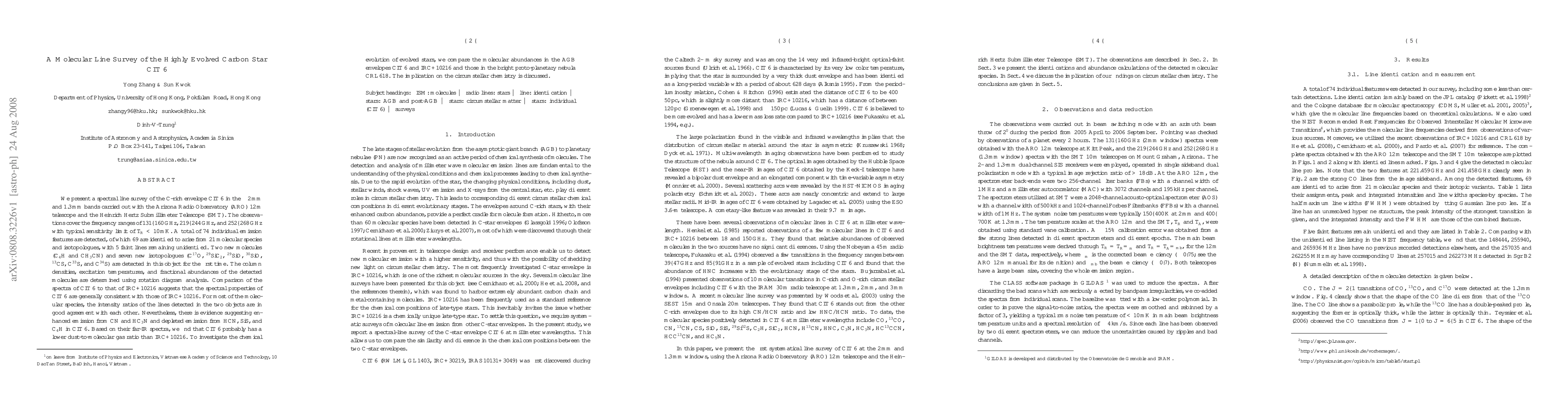 This study presents a detailed spectral line survey of the carbon-rich star CIT 6, detecting 74 emission features from 21 molecular species and isotopologues, including two new molecules and seven new isotopologues. The findings suggest that CIT 6 has a lower dust-to-molecular gas ratio than another studied star, with implications for understanding the chemical evolution of evolved stars.