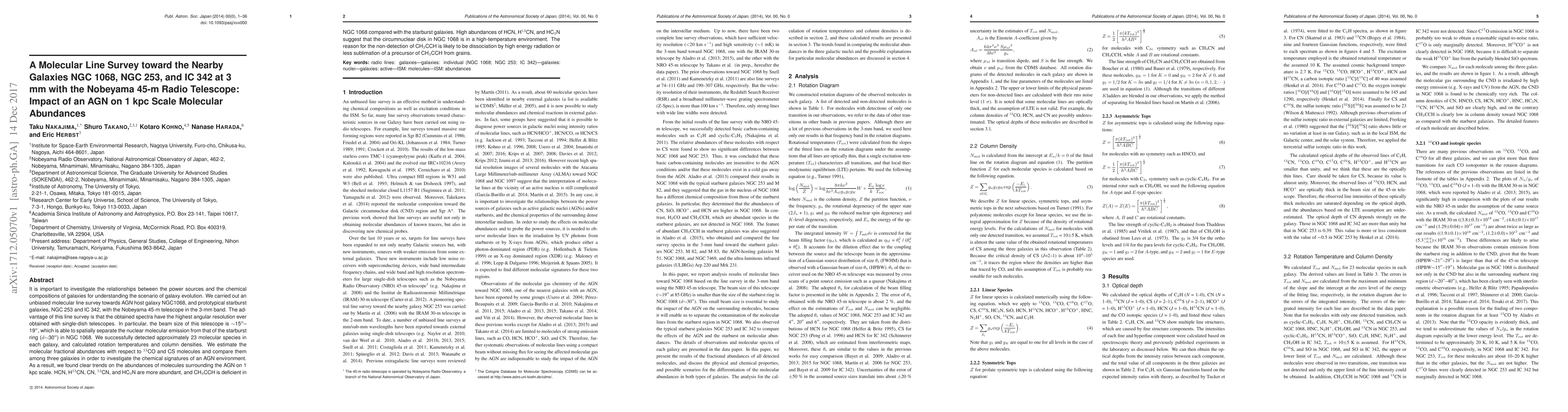 This study uses high-resolution molecular line surveys of nearby galaxies NGC 1068, NGC 253, and IC 342 to investigate the impact of an AGN on molecular abundances. Results show that the AGN in NGC 1068 enhances the abundance of certain molecules like HCN and HC3N, while reducing others like CH3CCH, indicating a high-temperature environment and possible dissociation effects.