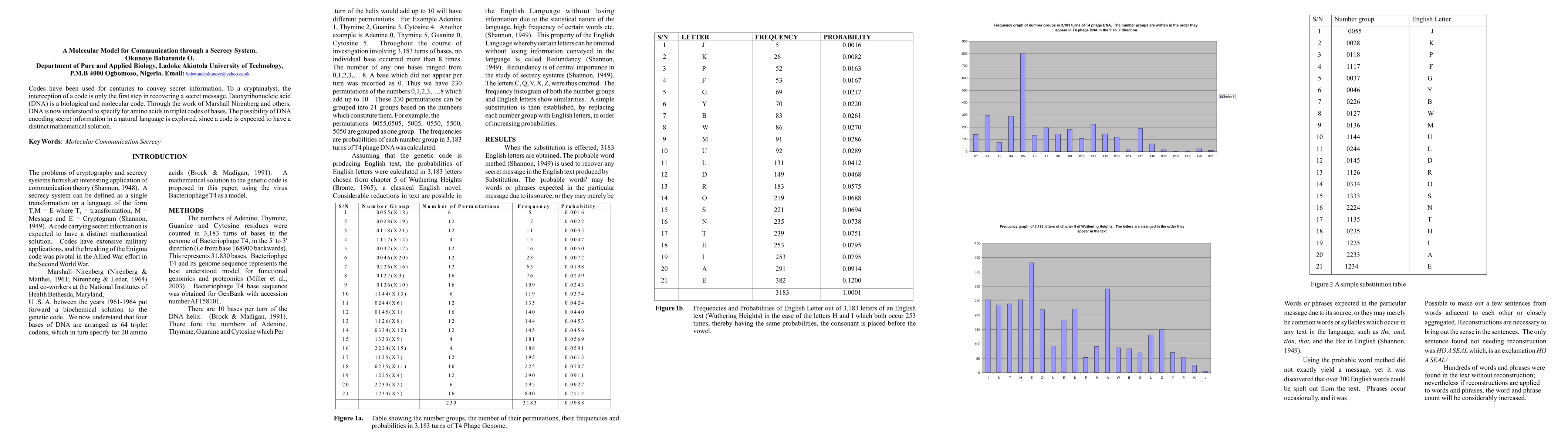 Codes have been used for centuries to convey secret information.To a cryptanalyst, the interception of a code is only the first step in recovering a secret message.Deoxyribonucleic acid (DNA) is a biological and molecular code.Through the work of Marshall Nirenberg and others, DNA is now understood to specify for amino acids in triplet codes of bases.The possibilty of DNA encoding secret information in a natural language is explored, since a code is expected to have a distinct mathematical solution.
