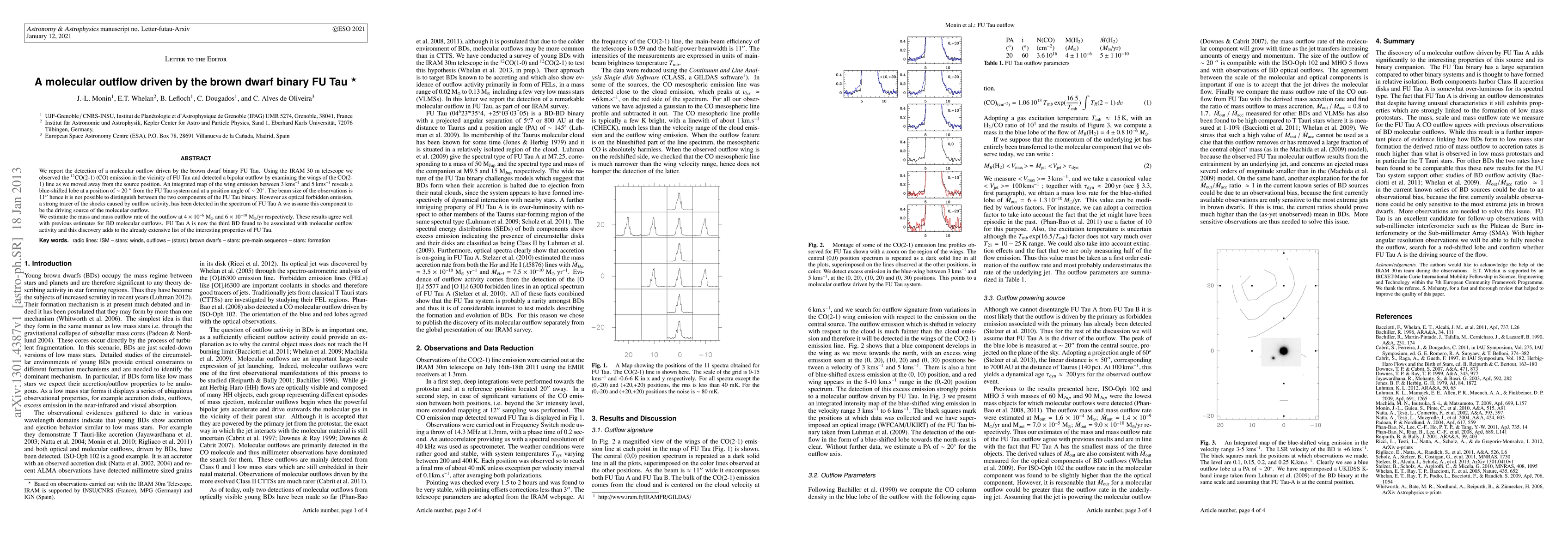 This paper reports the detection of a molecular outflow driven by the brown dwarf binary FU Tau using the IRAM 30 m telescope. The study reveals a bipolar outflow with a blue-shifted lobe, indicating FU Tau A as the likely driving source, and estimates the outflow's mass and rate, aligning with previous findings for similar outflows.