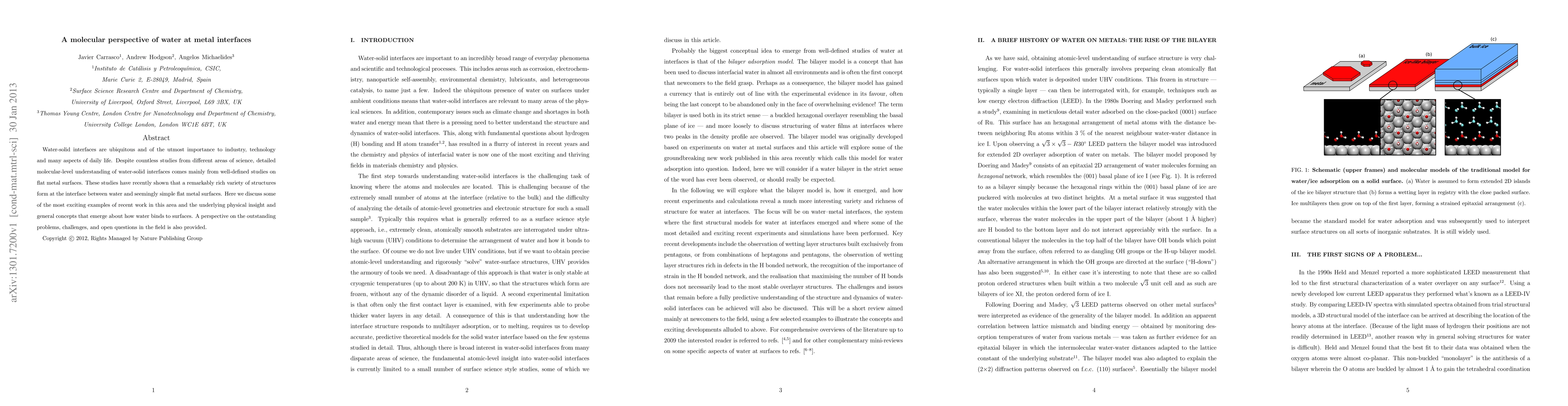 Water/solid interfaces are relevant to a broad range of physicochemical phenomena and technological processes such as corrosion, lubrication, heterogeneous catalysis and electrochemistry. Although many fields have contributed to rapid progress in the fundamental knowledge of water at interfaces, detailed molecular-level understanding of water/solid interfaces comes mainly from studies on flat metal substrates. These studies have recently shown that a remarkably rich variety of structures form at the interface between water and even seemingly simple flat surfaces. In this Review we discuss the most exciting work in this area, in particular the emerging physical insight and general concepts about how water binds to metal surfaces. We also provide a perspective on outstanding problems, challenges and open questions.