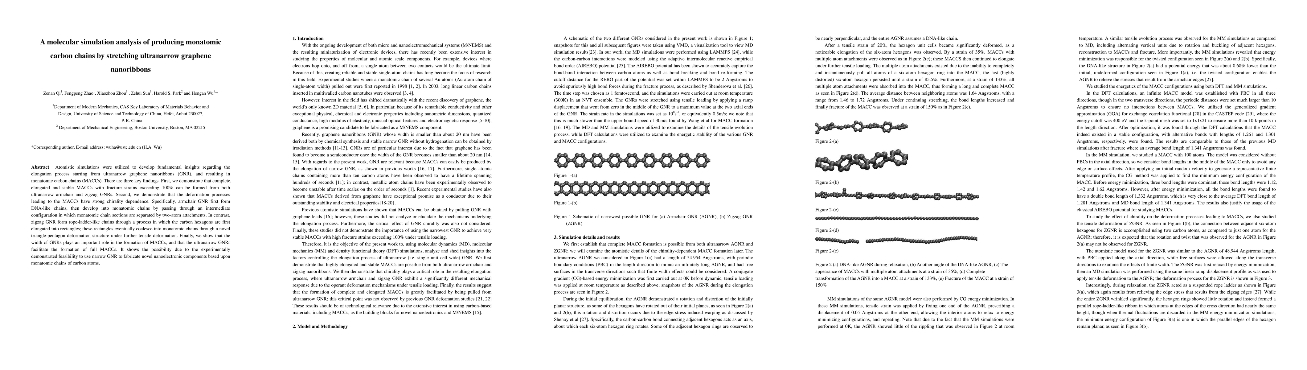 This study reveals the formation of monatomic carbon chains (MACCs) from ultranarrow graphene nanoribbons (GNRs) via atomistic simulations, finding that GNRs can stretch into stable MACCs exceeding 100% fracture strain. The process exhibits chirality dependence, with different deformation pathways for armchair versus zigzag GNRs, and highlights the importance of GNR width in MACC formation.
