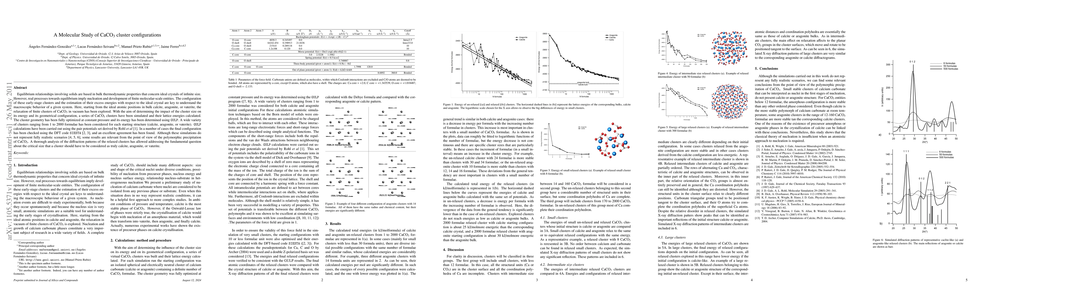 Equilibrium relationships involving solids are based on bulk thermodynamic properties that concern ideal crystals of infinite size. However, real processes towards equilibrium imply development of finite molecular-scale entities. The configuration of these early-stage clusters and the estimation of their excess energies with respect to the ideal crystal are keys to understanding the macroscopic behaviour of a given system. As nucleation events are difficult to study experimentally, both because they occur spontaneously and because the nucleus size is very small, atomistic simulations are a suitable tool for understanding the early stages of crystallisation. Here, starting from the ideal atomic positions in calcite and aragonite, the relaxation in vacuum of finite clusters of CaCO$_3$ is explored. Nucleation and growth of calcium carbonate phases constitute a very important subject of research in a wide variety of fields. A complete study of CaCO$_3$ should include many different aspects: size and shape of the critical nuclei under diverse conditions, possibility of nucleation from precursor phases, nucleus energy and nucleus surface energy, relationship nucleus-substrate in heterogeneous nucleation...We present a preliminary study of nucleation of calcium carbonate where nuclei are considered to be isolated from any previous phase or substrate. Even when this situation does in no way represent realistic conditions, it can be a helpful first approach to more complex studies.