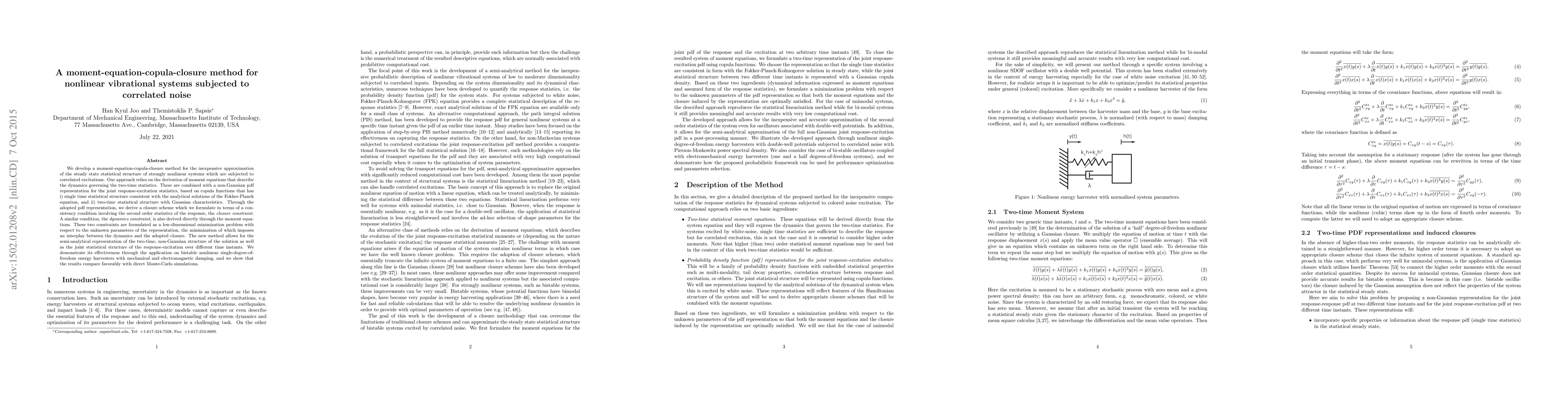 We develop a moment equation closure minimization method for the inexpensive approximation of the steady state statistical structure of nonlinear systems whose potential functions have bimodal shapes and which are subjected to correlated excitations. Our approach relies on the derivation of moment equations that describe the dynamics governing the two-time statistics. These are combined with a non-Gaussian pdf representation for the joint response-excitation statistics that has i) single time statistical structure consistent with the analytical solutions of the Fokker-Planck equation, and ii) two-time statistical structure with Gaussian characteristics. Through the adopted pdf representation, we derive a closure scheme which we formulate in terms of a consistency condition involving the second order statistics of the response, the closure constraint. A similar condition, the dynamics constraint, is also derived directly through the moment equations. These two constraints are formulated as a low-dimensional minimization problem with respect to unknown parameters of the representation, the minimization of which imposes an interplay between the dynamics and the adopted closure. The new method allows for the semi-analytical representation of the two-time, non-Gaussian structure of the solution as well as the joint statistical structure of the response-excitation over different time instants. We demonstrate its effectiveness through the application on bistable nonlinear single-degree-of-freedom energy harvesters with mechanical and electromagnetic damping, and we show that the results compare favorably with direct Monte-Carlo Simulations.
